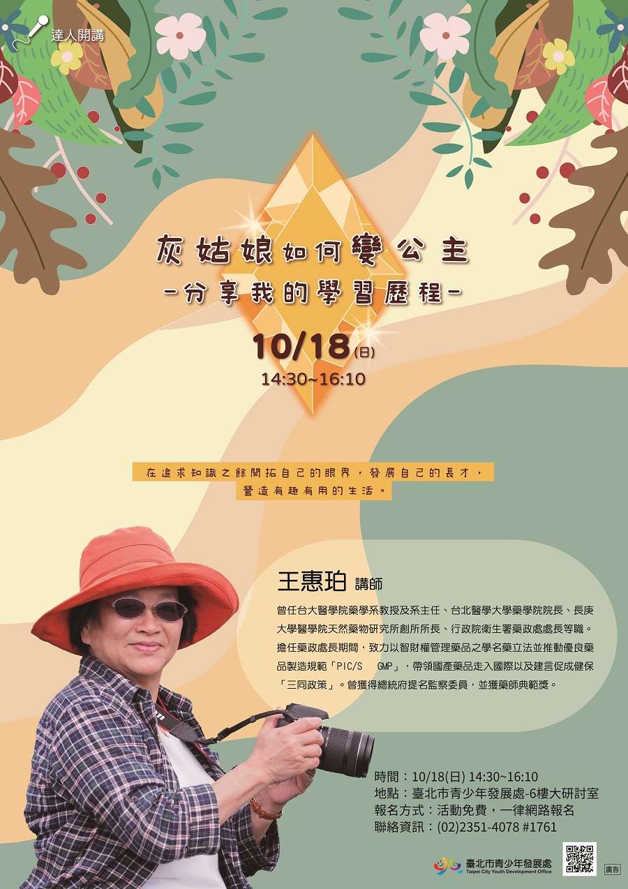 10月18日14:30舉辦達人開講 「灰姑娘如何變公主—分享我的學習歷程」,王惠珀與 您分享如何治學,讓自己成為有宏觀境界的知識分子, 營造一個有趣有用的入世生活。活動免費,詳見青發處 官網。