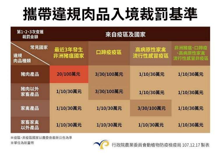 四、依據動物傳染病防治條例第45條之1規定及行政院農業委員 會動植物防疫檢疫局107年12月18日公告的裁罰基準(如附 件),旅客自發生非洲豬瘟國家違規攜帶豬肉產品入境未 申報檢疫者第1次處新臺幣(以下同)20萬元、第2次處100 萬元以下罰鍰,外籍人士不具居留證,第1次受罰20萬元罰 鍰且未能立即繳清者,拒絕其入境。