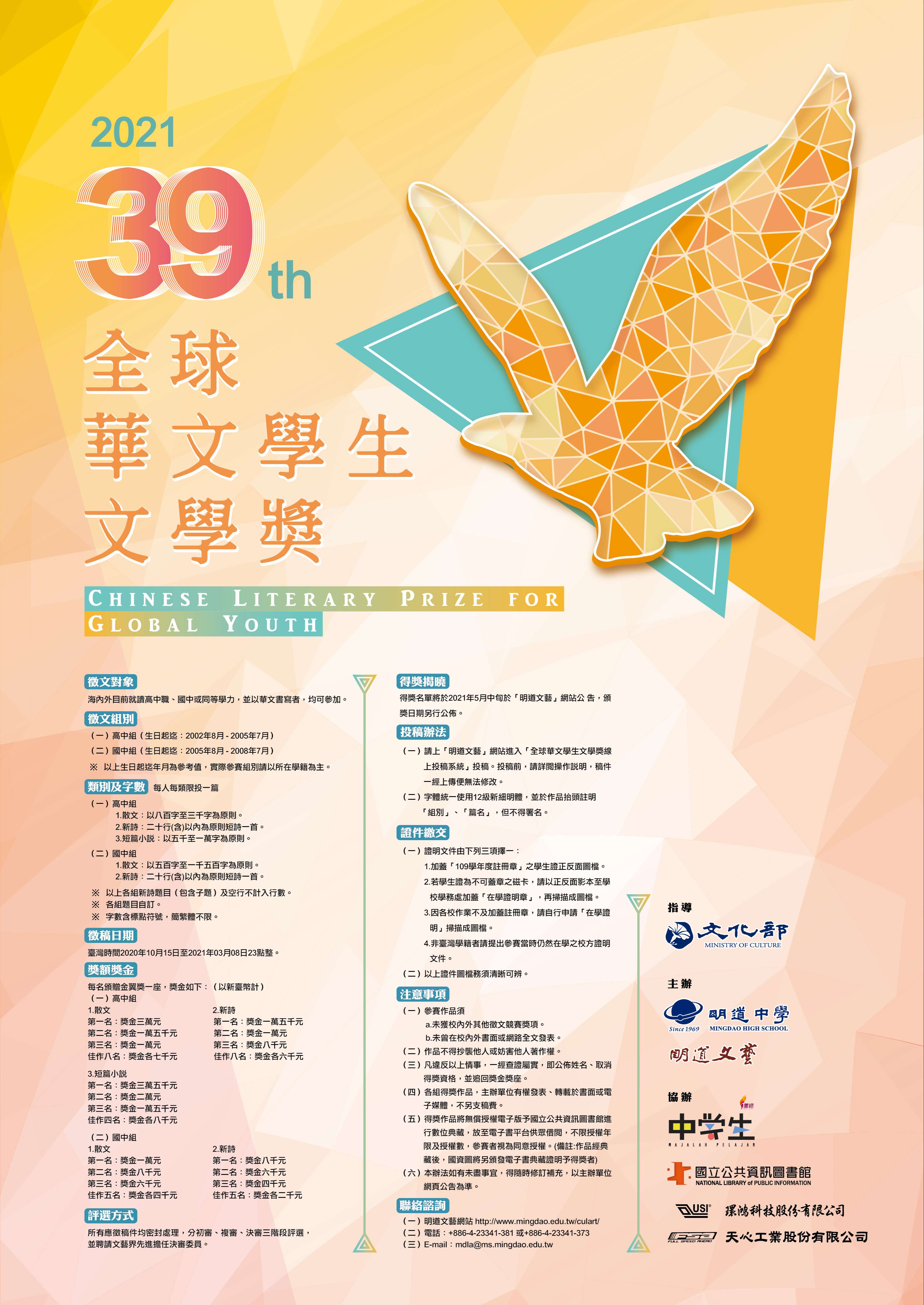 徵文日期為民國109年10月15日至民國110年3月8日截止。全球投稿皆使用「明道文藝網站」線上投稿方式,網址如下http://www.mingdao.edu.tw/culart/culart0704/2021-nslp/nslp2020-1.html。