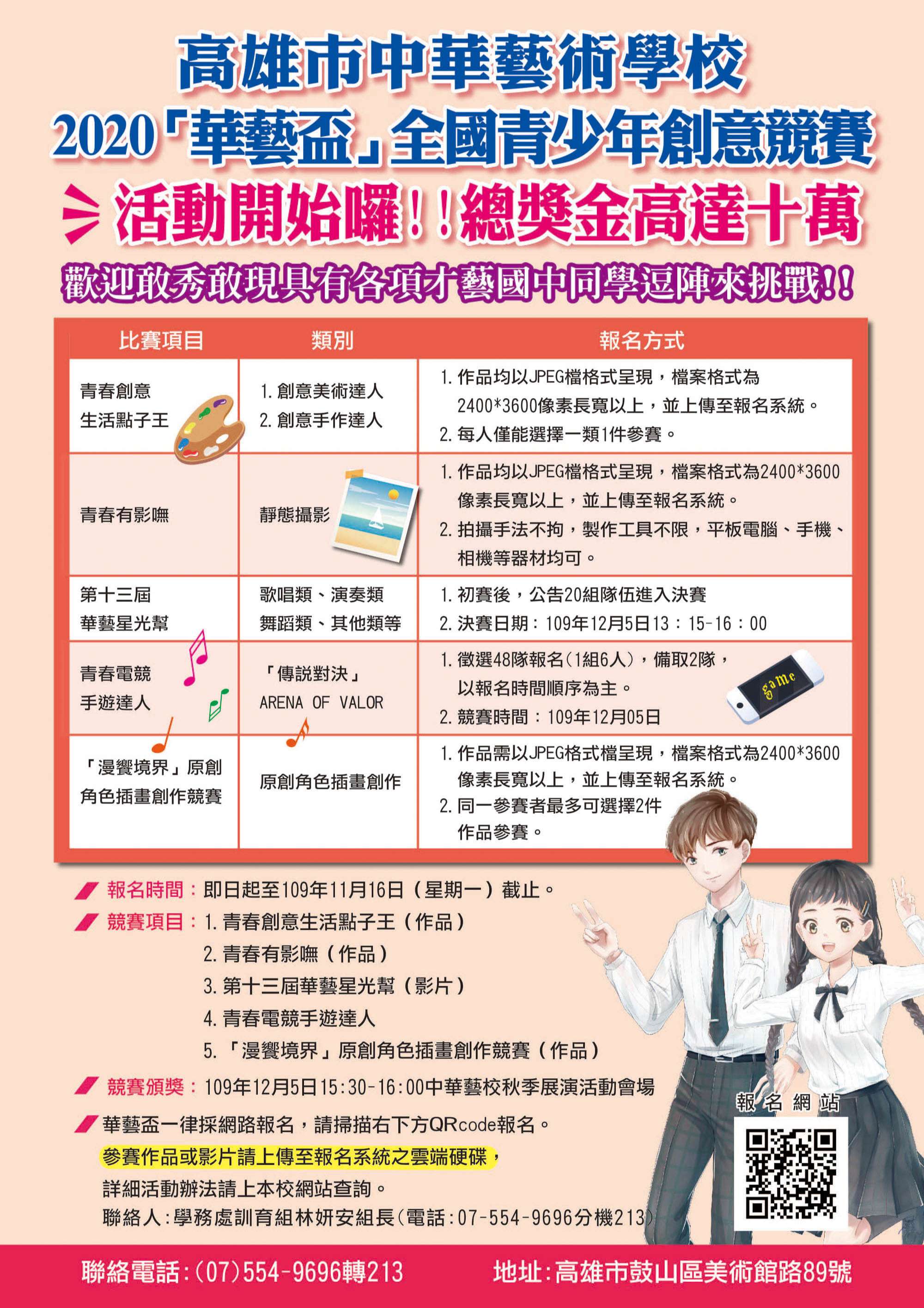 (六)競賽項目:參賽作品或影片請上傳至報名系統之雲端硬 碟 1、青春創意生活點子王(作品) 2、青春有影嘸(作品) 3、第十三屆華藝星光幫(影片) 4、青春電競手遊達人(現場) 5、「漫饗境界」原創角色插畫創作競賽(作品) 三、星光幫才藝競賽及電競達人競賽入圍參賽為109年12月5 日。
