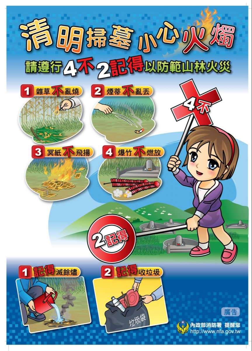 清明掃墓慎終追遠的時節又到了,由於掃墓焚燒香燭、紙錢及雜草等易引發火災,為防範未然,請市民朋友上山掃墓後確實撲滅燃燒物,並且勿亂丟菸蒂及燃放爆竹,共同做好火災預防工作。