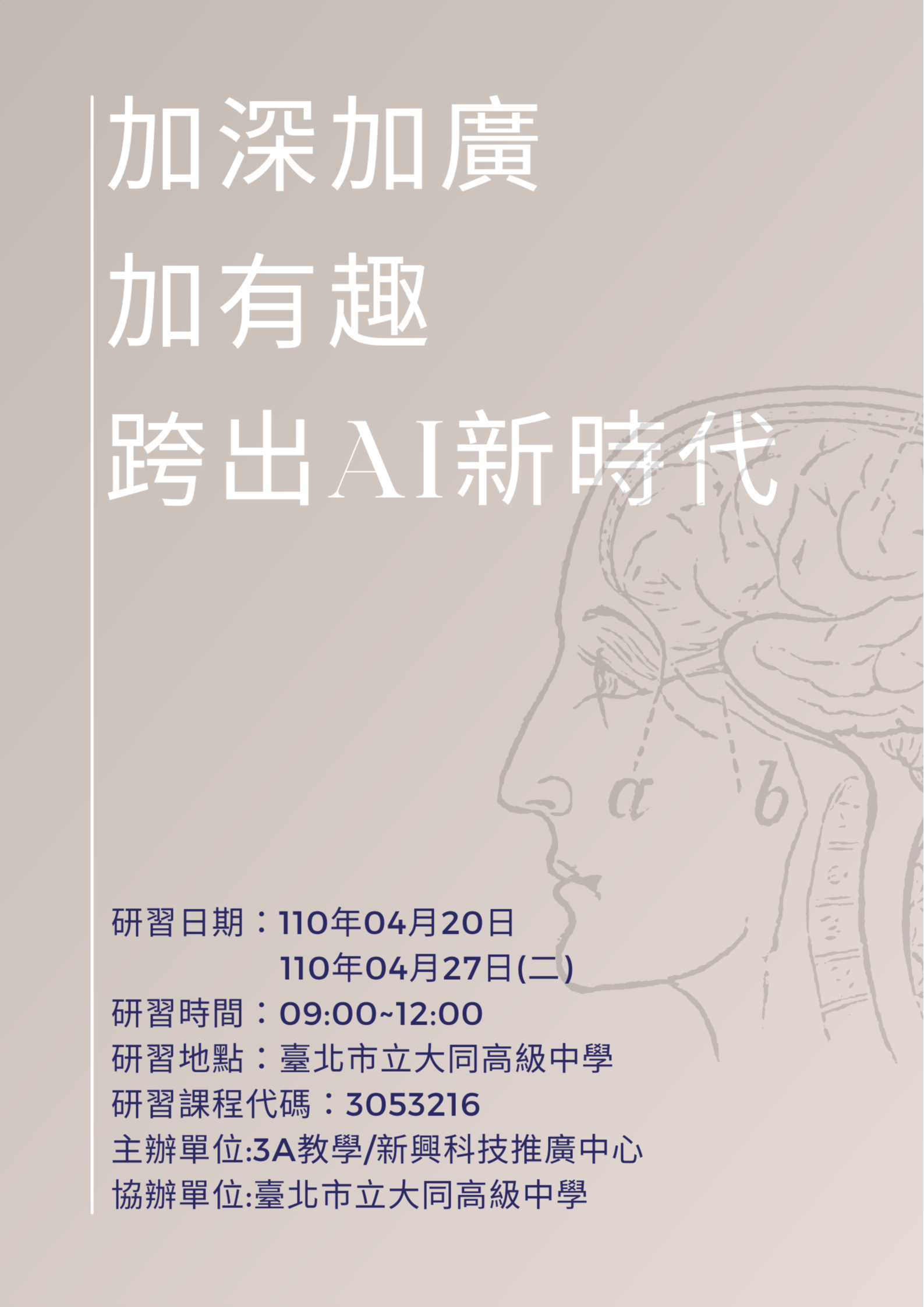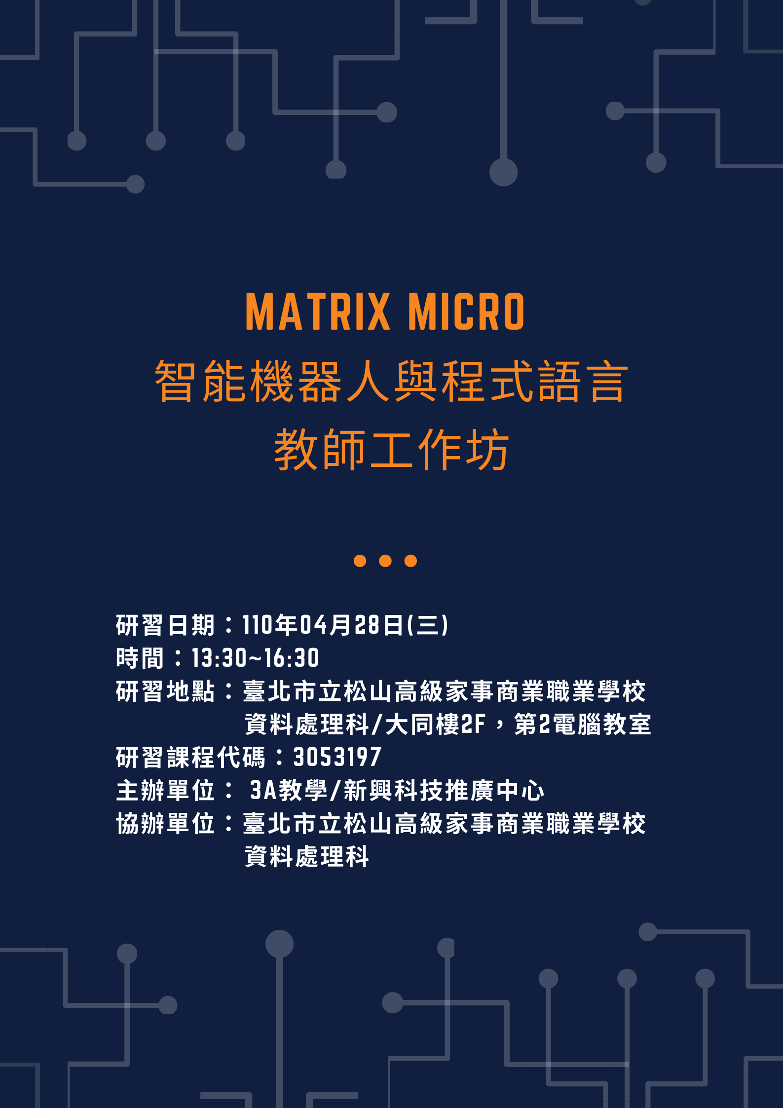 一、臺北市3A教學基地中心(永春高中)辦理「加深加廣加有趣~跨出AI新時代」、「MATRIX MICRO 智能機器人與程式語言」教增能師工作坊,課程於全國教師研習網報名,代碼為:3053216與3053197。