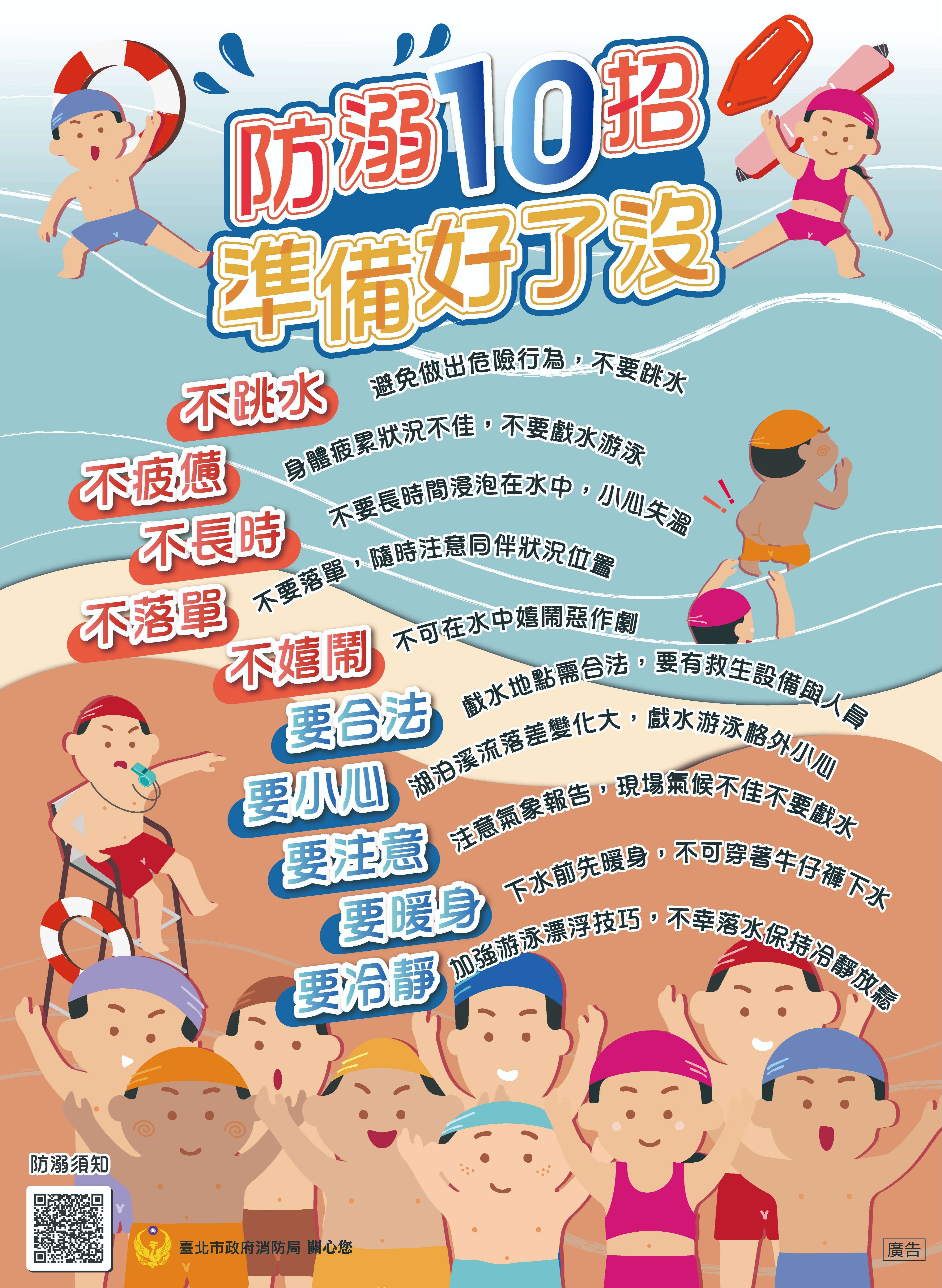依據教育部及媒體報導顯示,國內近期溺水事件頻傳,造成年輕學子生命威脅,家長及親友對突如其來之意外均造成莫大打擊與遺憾。基於「預防為先」,加強宣導游泳或戲水安全觀念,防範相關溺水事件發生,是大家共同責任。面對即將到來的暑假假期,請家長們一起來為孩子的安全把關。
