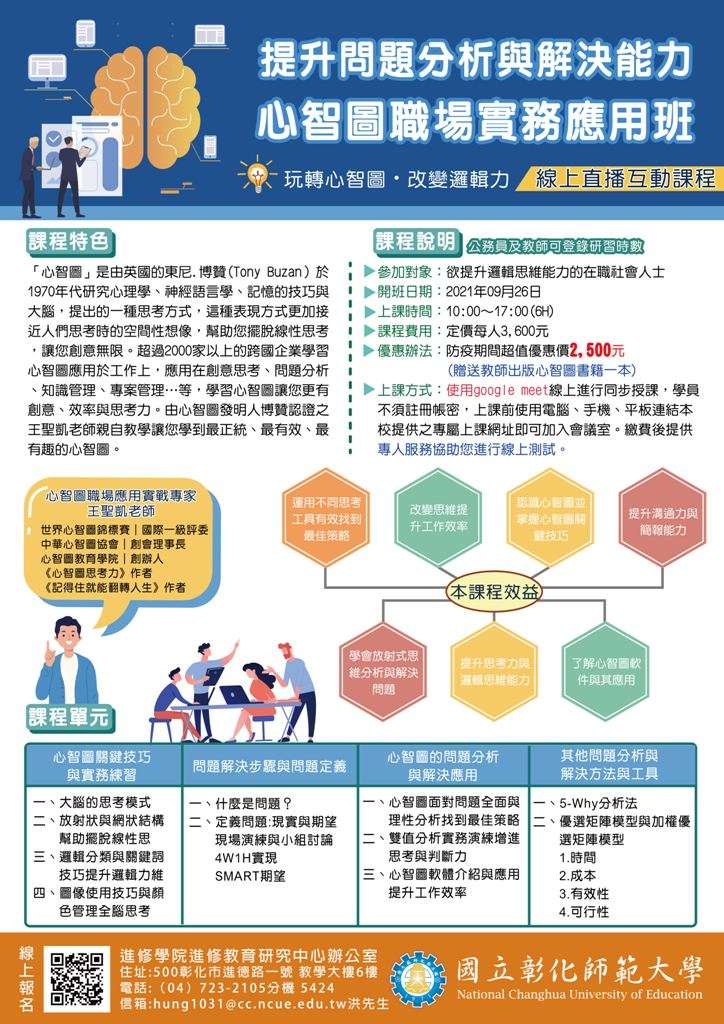 一、「提升問題分析與解決能力-心智圖職場實務應用班」課程時間為110年9月26日(日) 10:00-17:00,合計6小時,公務人員及教師可登錄研習時數,本課程為遠距直播互動課程,課程費用每人3,600元,贈教師出版心智圖書籍,防疫期間線上課程超值優惠方案每人2,500元。