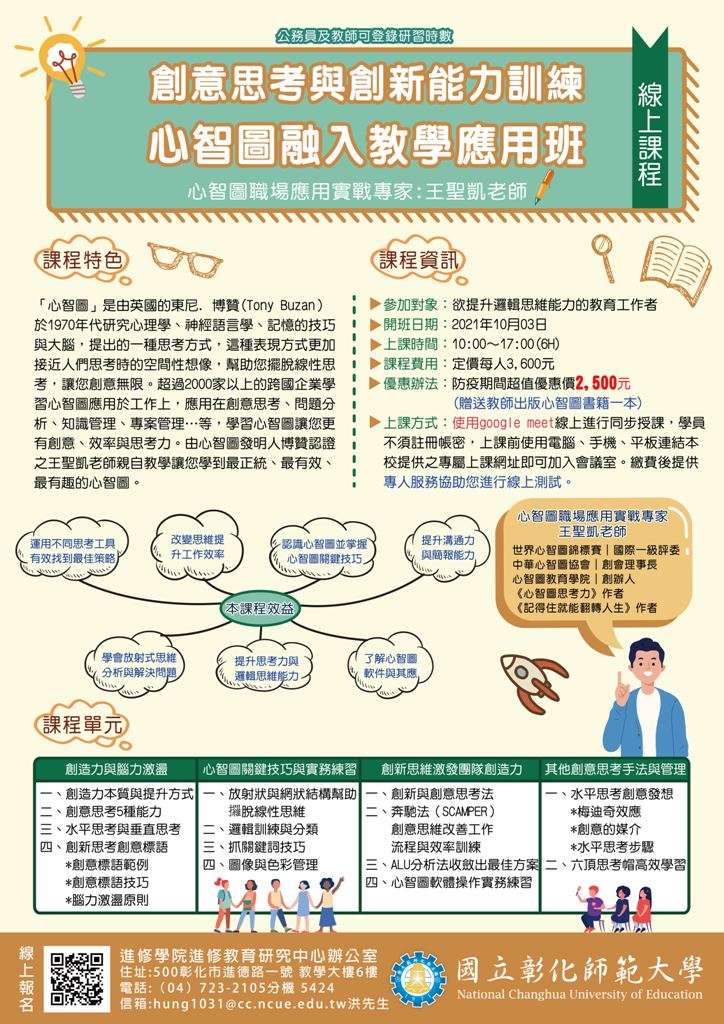二、「創意思考與創新能力訓練-心智圖融入教學應用班」課程時間為110年10月3日(日) 10:00-17:00,合計6小時,公務人員及教師可登錄研習時數,本課程為遠距直播互動課程,課程費用每人3,600元,贈教師出版心智圖書籍,防疫期間線上課程超值優惠方案每人2,500元。