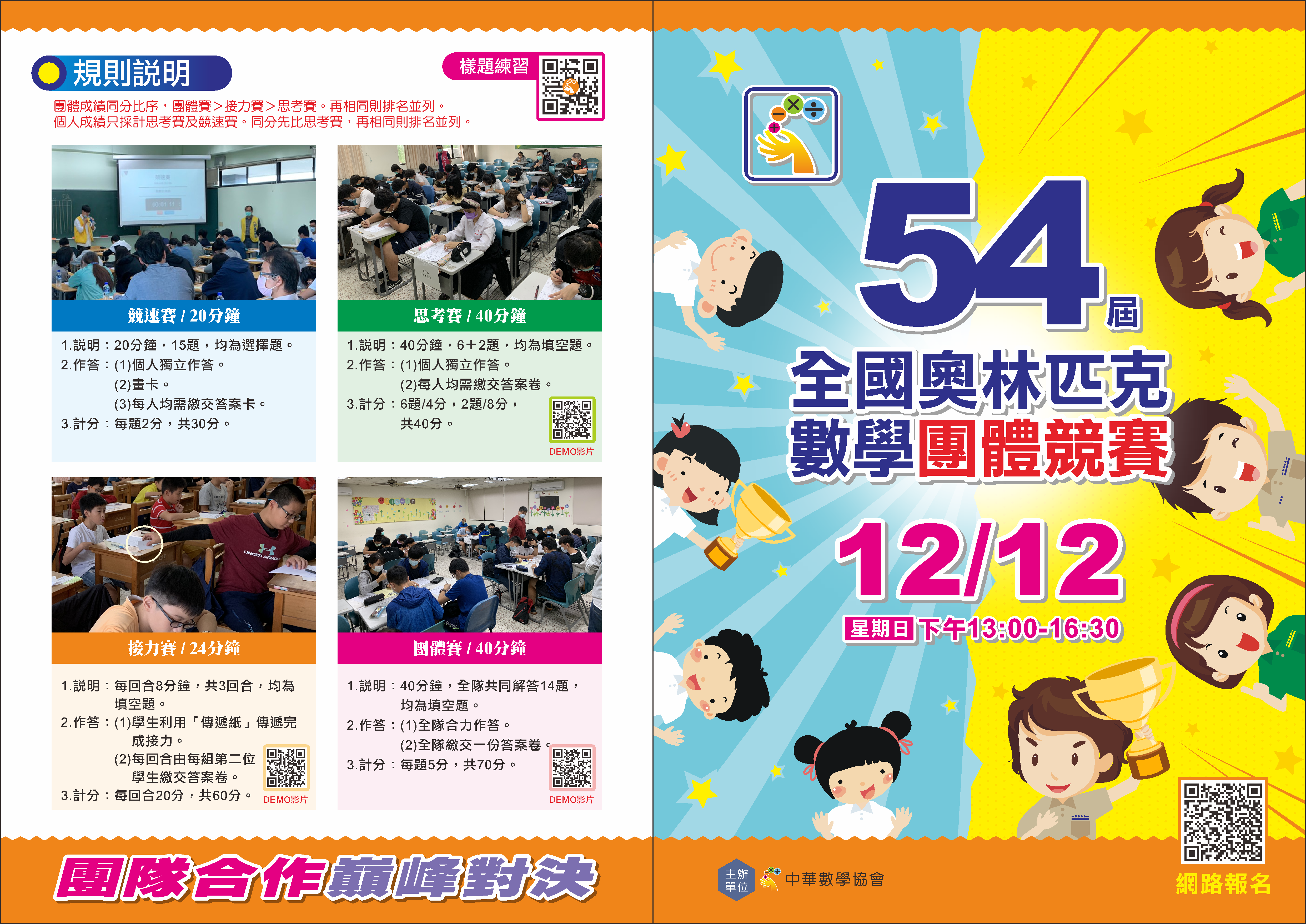 二、檢附「第54屆全國奧林匹克數學團體競賽」競賽活動簡章,供貴校參閱。