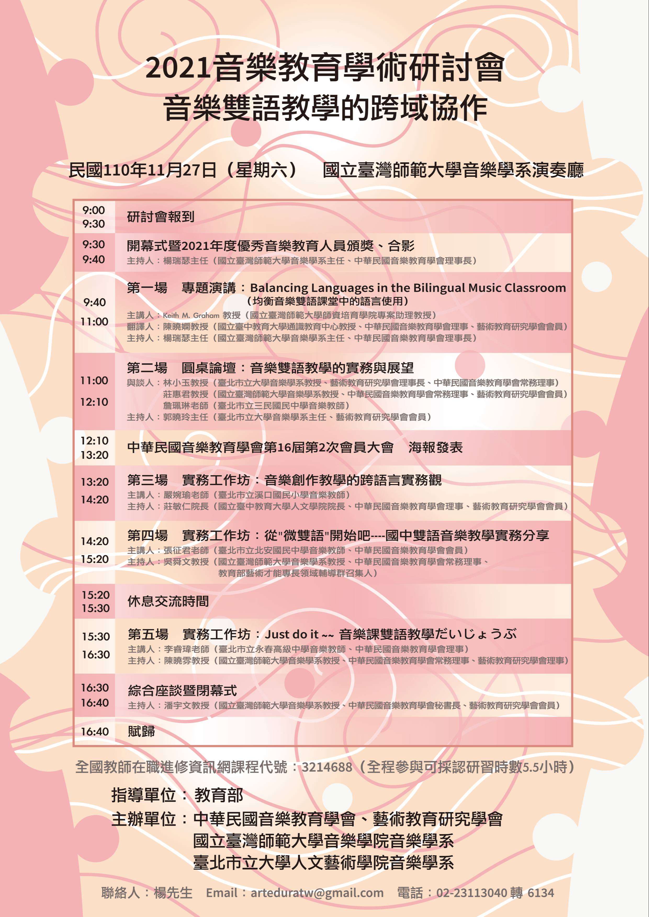 一、旨揭研討會由本校音樂學系與國立臺灣師範大學音樂學系、中華民國音樂教育學會、藝術教育研究學會聯合舉辦,謹訂於110年11月27日(星期六)假國立臺灣師範大學音樂學系演奏廳舉行,請邀貴局(處/校)鼓勵相關人員報 名參加並惠予公(差)假出席,檢附活動海報如附件。