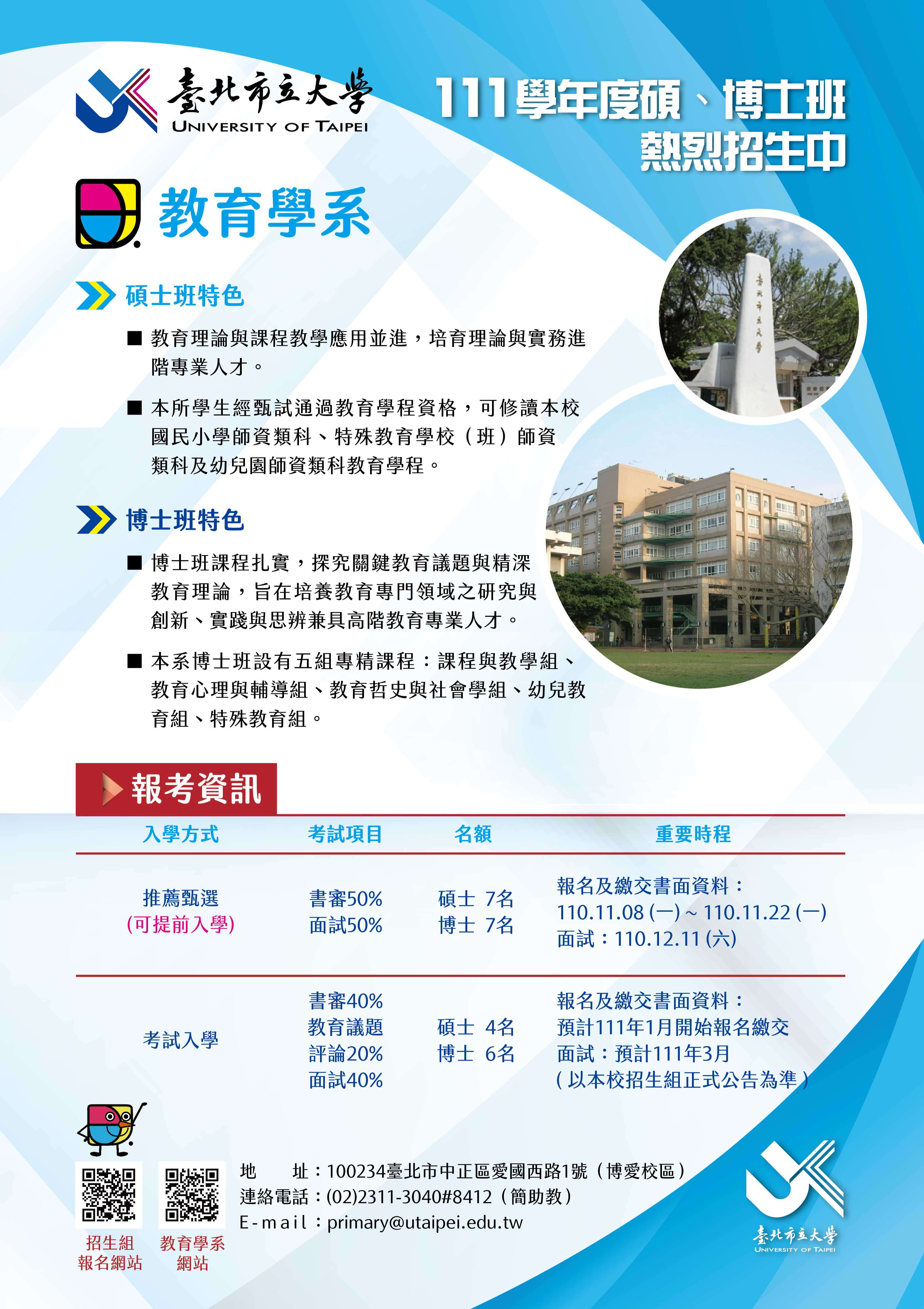 一、該校為全臺第一所高等教育學府,教育學系承接師資培育與學術研究百年基業。碩士班考試入學招生7名;博士班設有五組專精課程:課程與教學組、教育心理與輔導組、教 育哲史與社會學組、幼兒教育組與特殊教育組,合計招生7名。