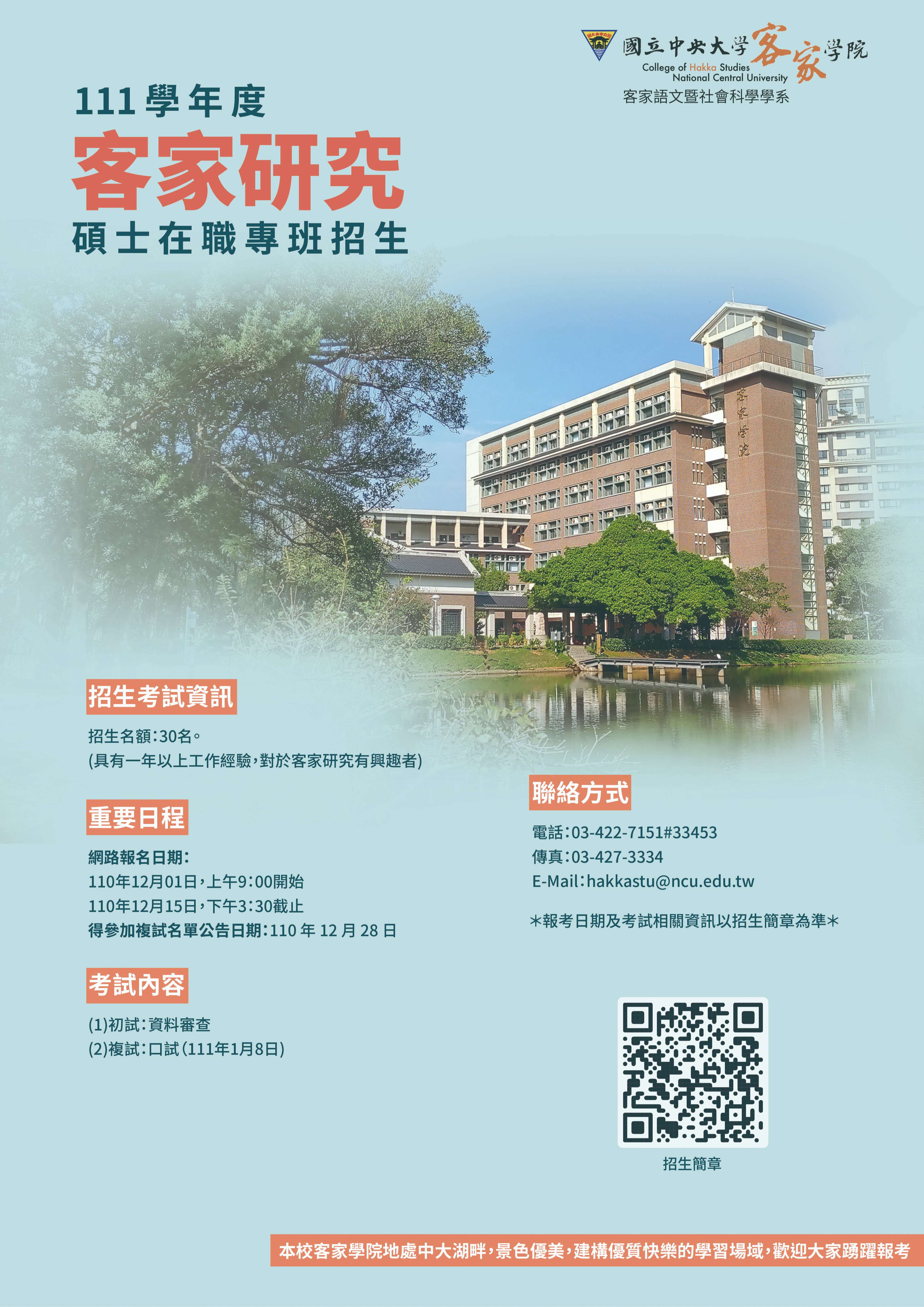 一、該校客家語文暨社會科學學系「客家研究碩士在職專班」 111學年度招生,考試方式為初試:資料審查(免筆試)及複試:口試,招生海報如附件。