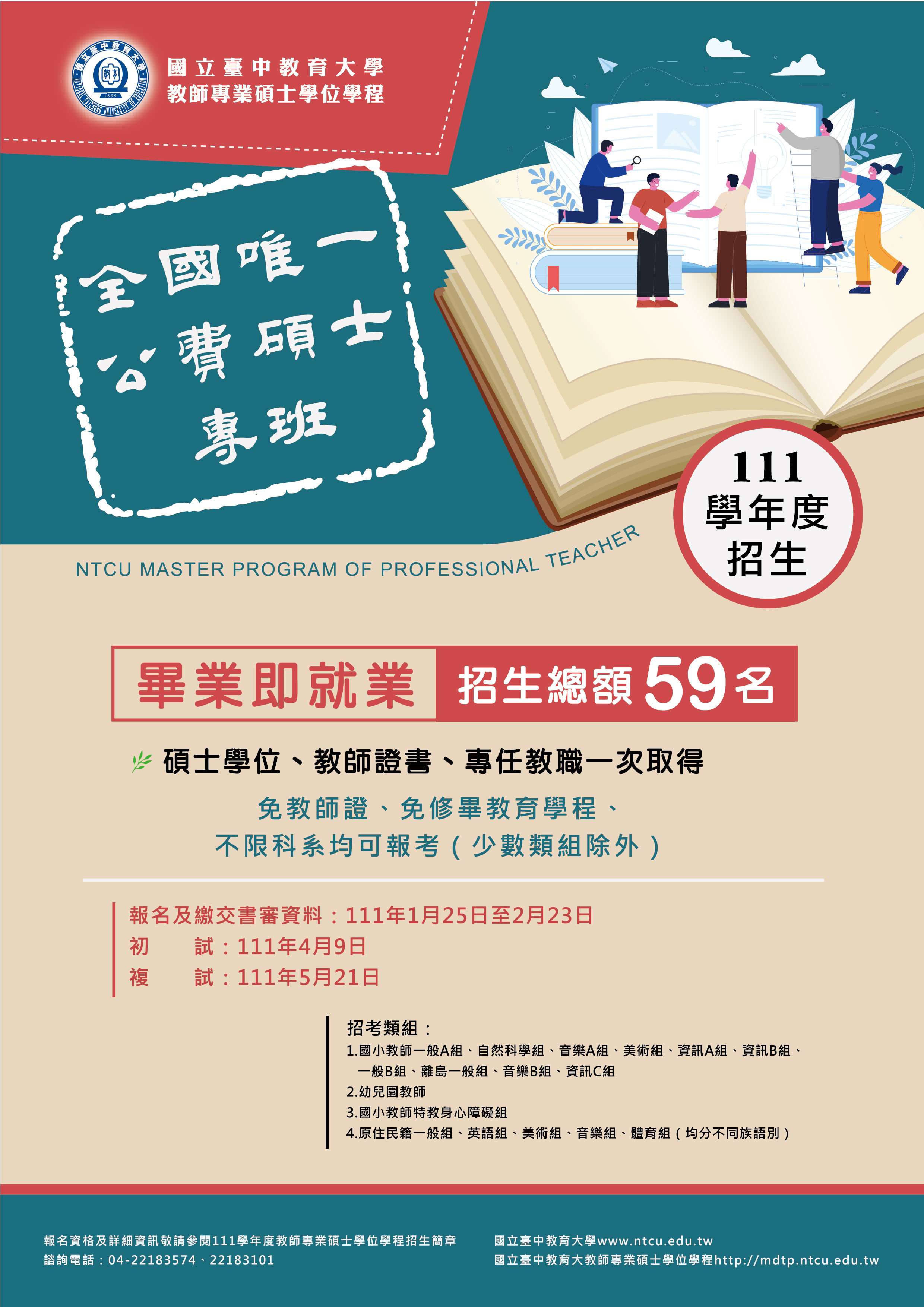 一、本校教師專業碩士學位學程為碩士公費師資專班,教師證書、專任教職、碩士學位一次取得,歡迎有志投入偏鄉教育志業的學子及代理代課教師報考。