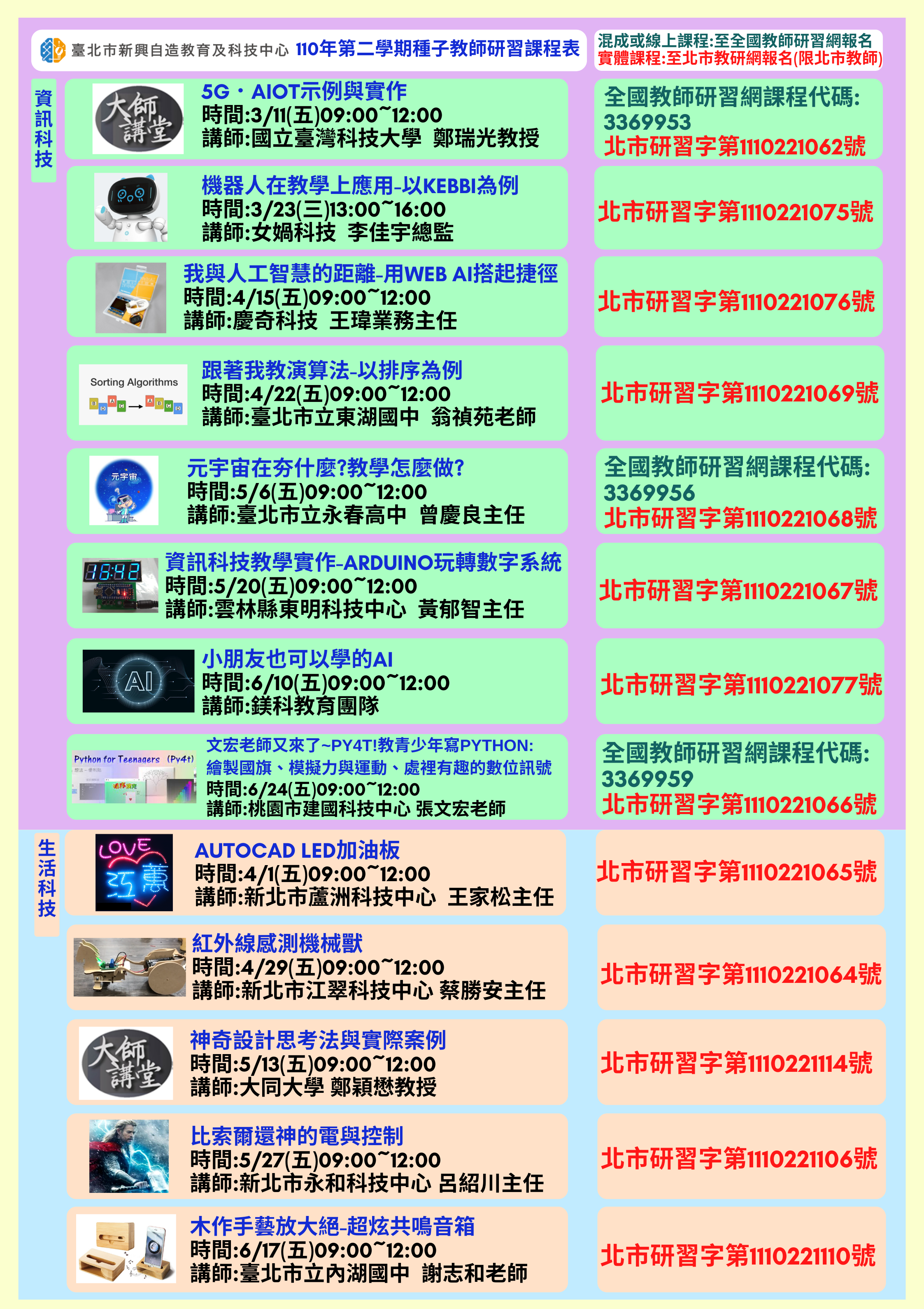二、為輔助推動新課綱、培養師生自造精神、提升科技領域師資的專業與質量,並強化科技領域教師融合新興科技,帶領學生實作應用以落實學生科技素養與知能,特辦理生活科技與資訊科技種子教師增能研習課程。
