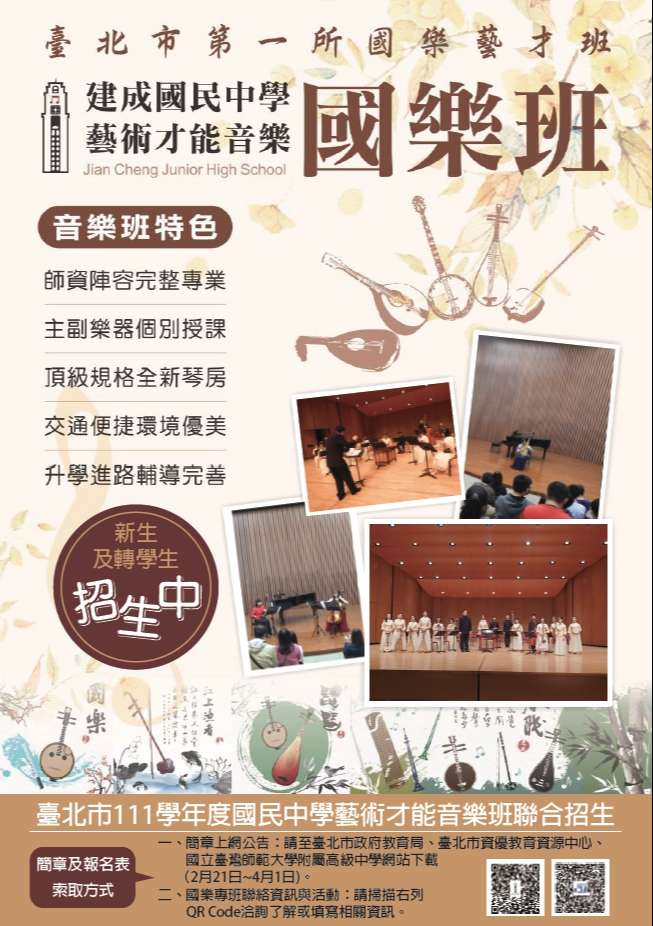 一、本校於107年度開設臺北市國中第一所國樂專班,招收國樂主修的七年級新生及七年級升八年級轉學生,以推廣發揚國樂及輔導高中音樂班升學為目標。