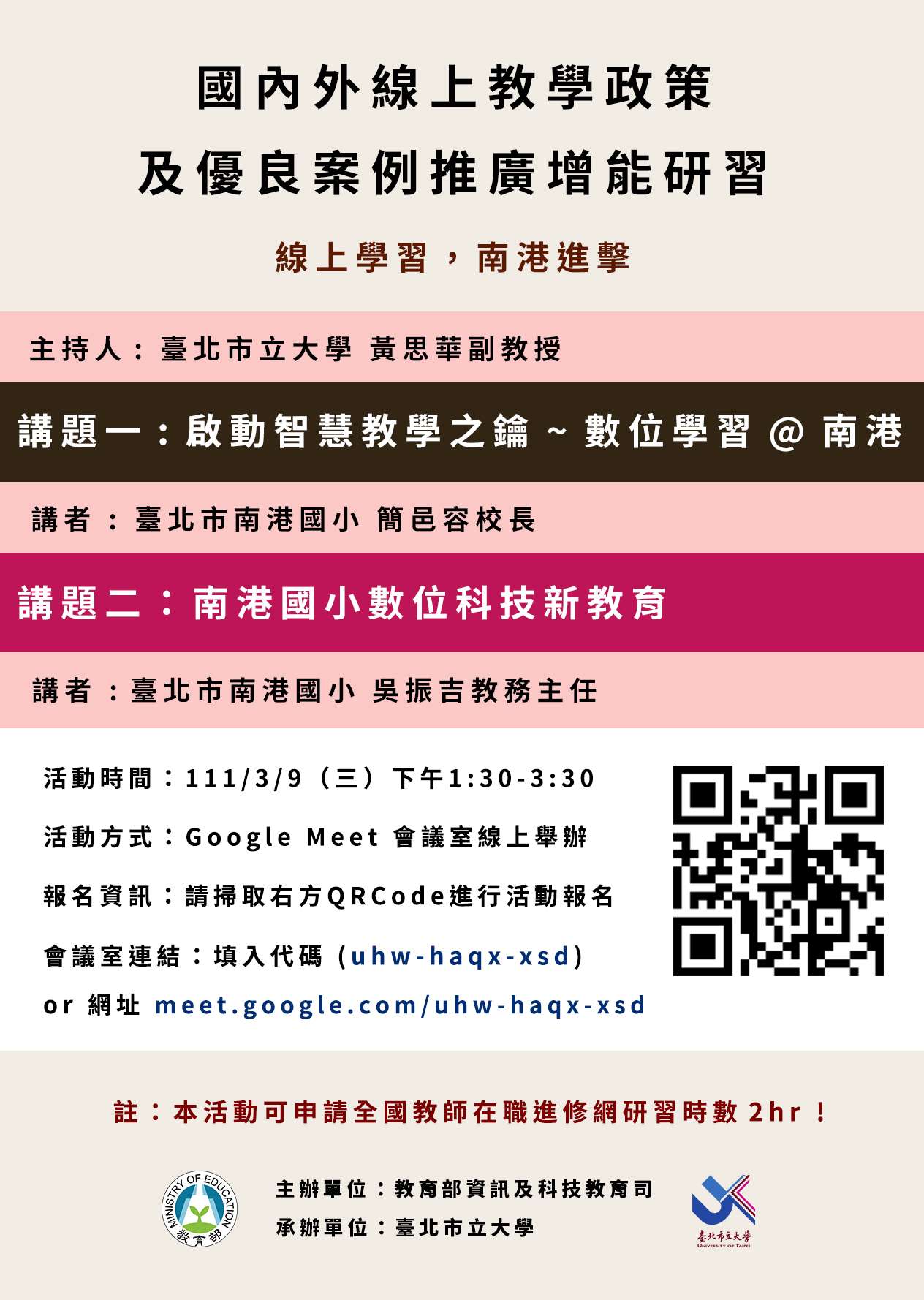 (一)研習時間:本(111)年3月9日(三)下午1時30分至3時30分。