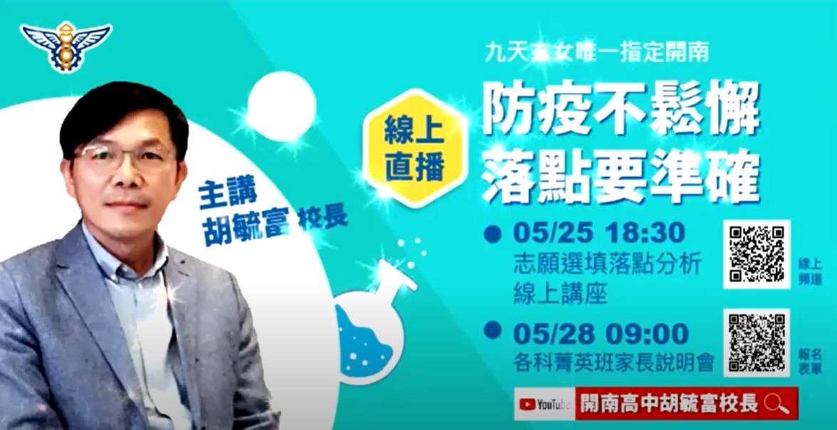 (二)「防疫不鬆懈、落點要準確」5月25日 18:30 國中會考志願選填落點分析(https://youtu.be/aBLzsEZvYkk)