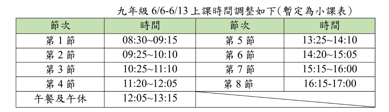 本校七、八年級自111年6月6日(星期一)起恢復實體課程,九年級持續進行遠距教學至6月13日(星期一)。