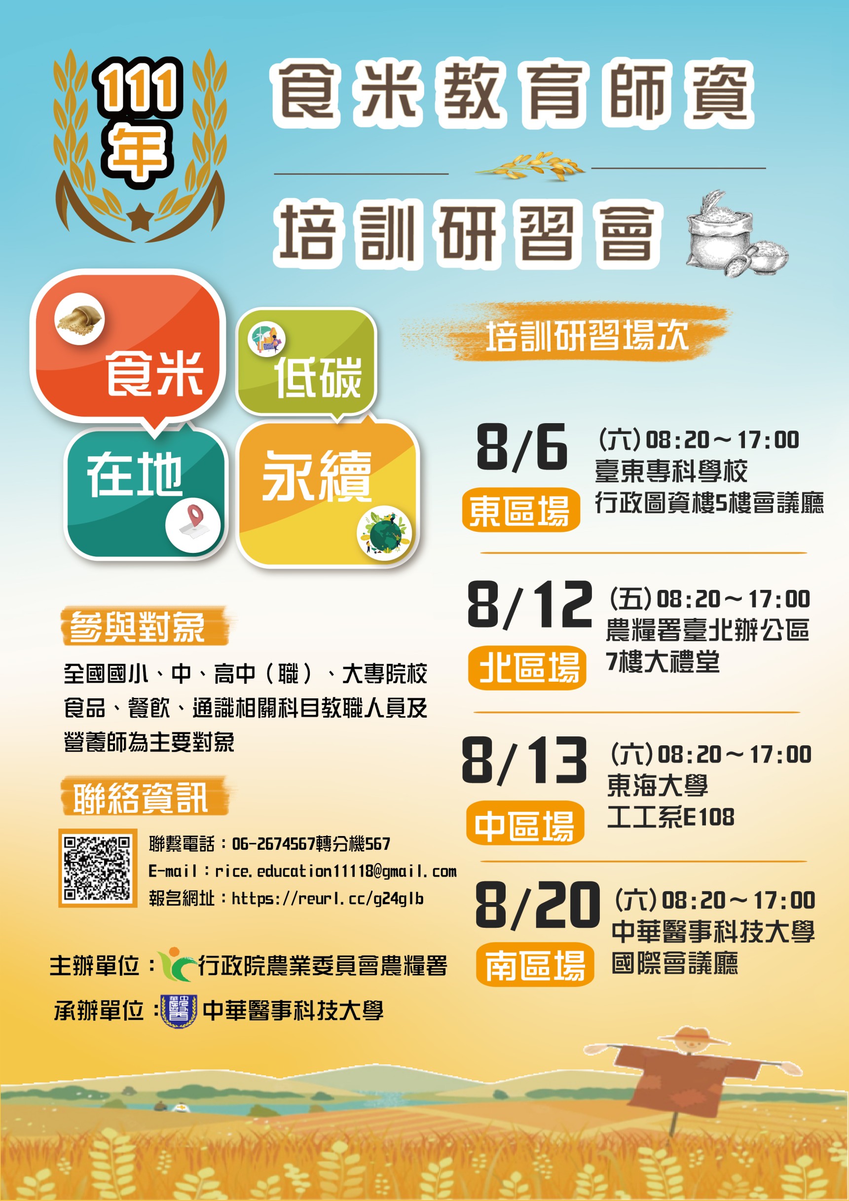 三、報名簡章及宣傳海報(如下圖);研習相關問題請洽中華醫事科技大學林怡如小姐,電話:06-2674567轉567,E-mail:rice.education11118@gmail.com。
