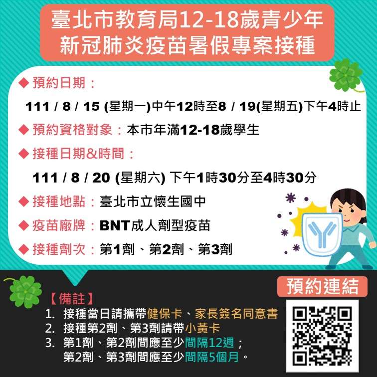轉知為辦理本市12至18歲學生新冠肺炎BNT疫苗暑假集中接種作業,請尚未完成3劑疫苗施打,且有意願接種疫苗者於111年8月15日(星期一)中午12時至8月19日(星期五)下午4時前自行完成預約,並於開學後帶小黃卡至健康中心補登資料。