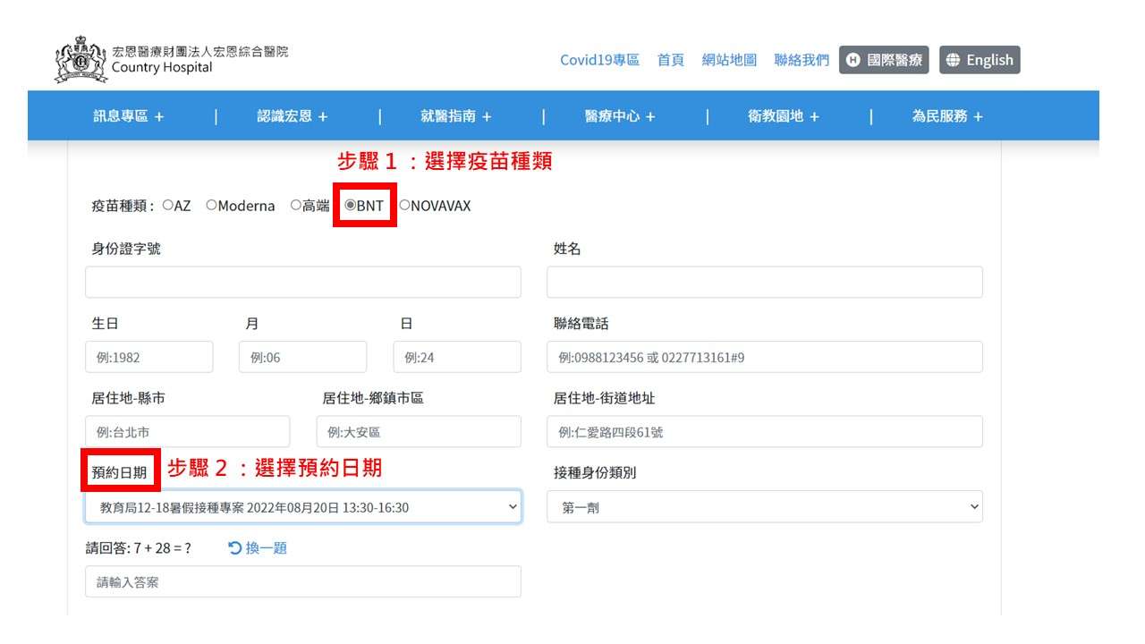 三、請符合資格(12-18歲)學生家長,如有意願報名暑假專案接種,請家長於111年8月15日(星期一)中午12時至111年8月19日(星期五)下午4時前自行至宏恩綜合醫院網站預約(網址:https://app.country.org.tw/cWeb),逾時不候。