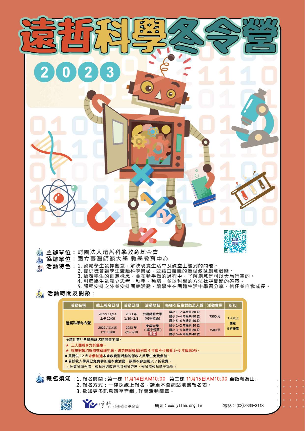 二、財團法人遠哲科學教育基金會與國立臺灣師範大學數學教育中心合作辦理「2023遠哲科學冬令營」。歡迎有興趣學生踴躍報名參加。詳情請見附件活動DM及活動簡章。
