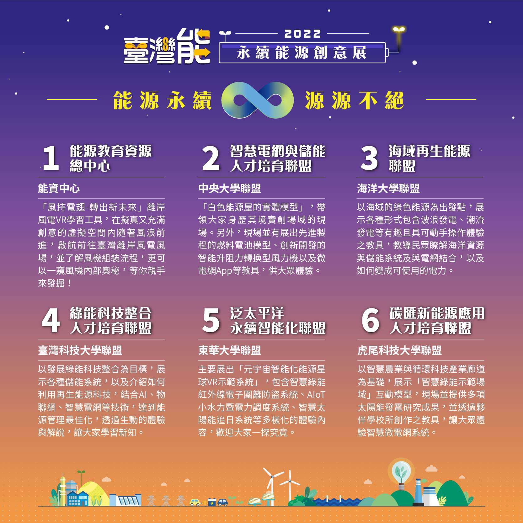 一、由國立科學工藝博物館館與教育部永續能源跨域應用人才培育計畫辦公室共同主辦,且由各聯盟中心共同合辦,今年度以「2022臺灣『能』-永續能源創意展」為主題,於12月3日起於國立科學工藝博物館展出,預定展出111年度計畫項下各單位執行成果,內容包含多項能源科技實驗教具, 現場並設有能源科技動手做活動與能源教具闖關活動,富含環境教育意義,適合各年齡層民眾參與體驗。