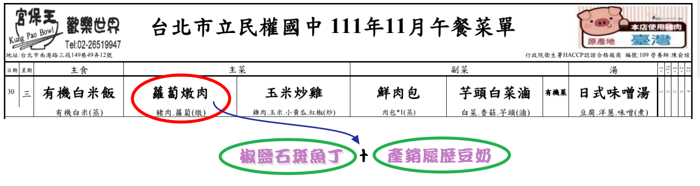 (三)宮保王第二次「石斑魚」食材料理為「椒鹽石斑魚丁」,並依專案取代(原菜單)一道菜色「蘿蔔燉肉」為「產銷履歷豆奶」。