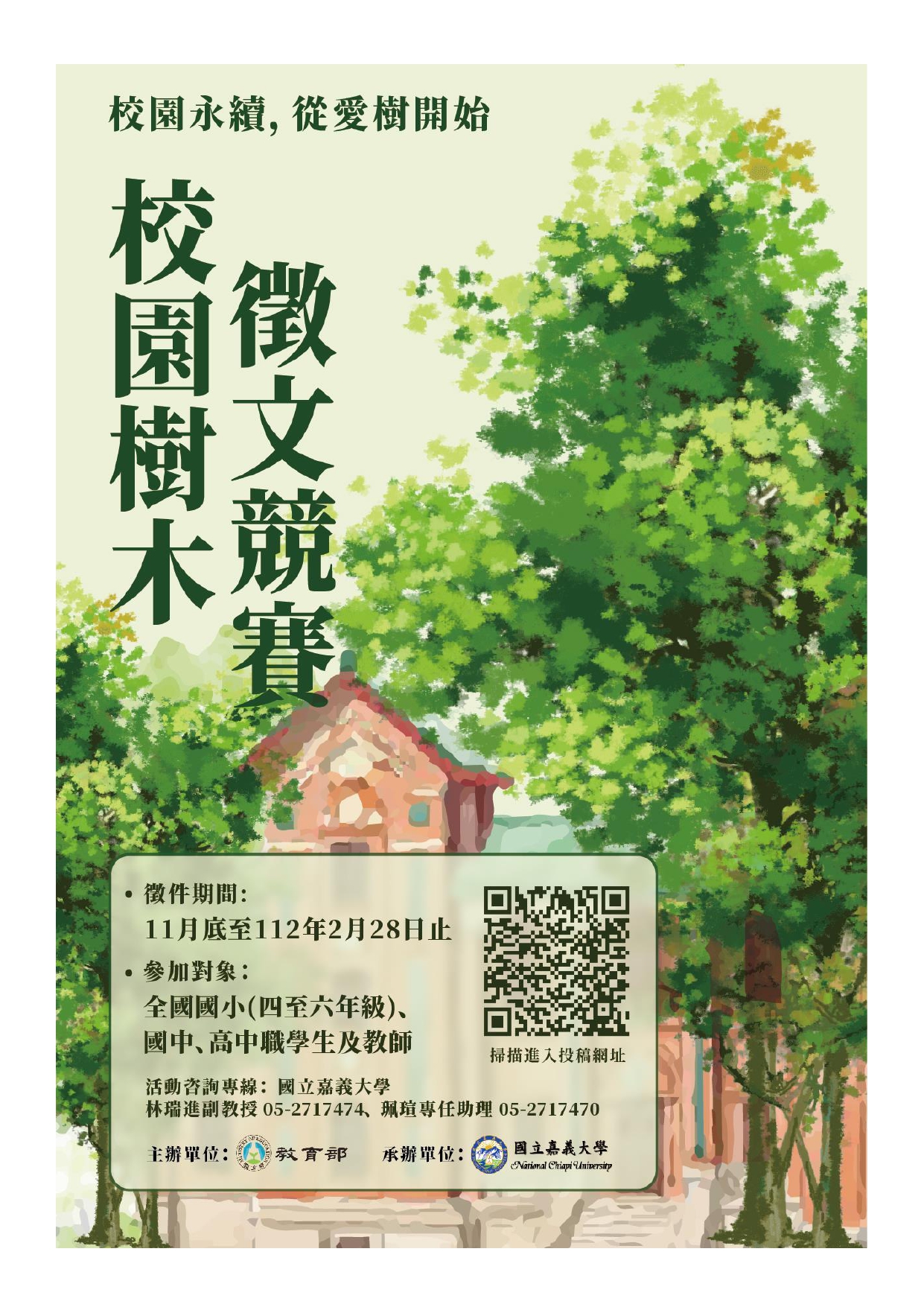 宣傳教育部辦理「111年度校園樹木徵文競賽」簡章及活動海報(如附圖),鼓勵師生踴躍報名參與。