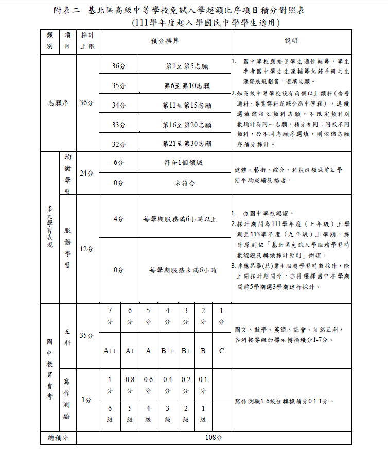 自111學年度起入學國民中學學生適用之超額比序項目,