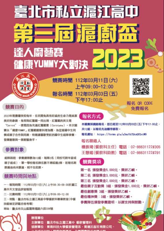 (一) 「滬廚盃」聯絡人:楊雅琦(餐飲科主任)電話:02- 86631122#305;王慧媚(餐飲科助教)電話:02- 86631122#291