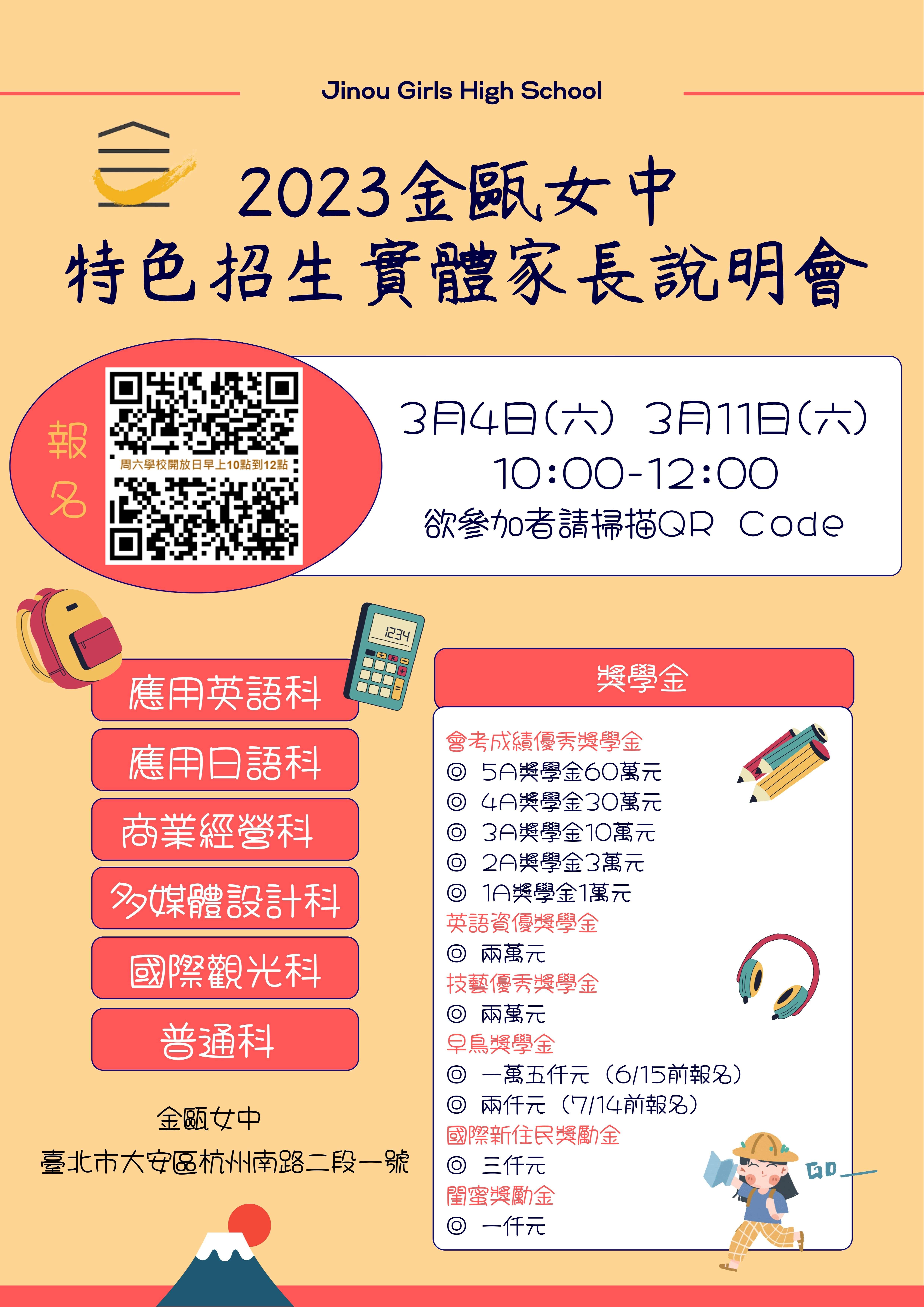 一、本校定於民國112年3月4日(星期六)、3月11日(星期六)上 午10時至12時假本校英語情境教室辦理【特色招生家長說明會】活動,歡迎貴校家長及學生報名參加,需遵守相關防疫規定。