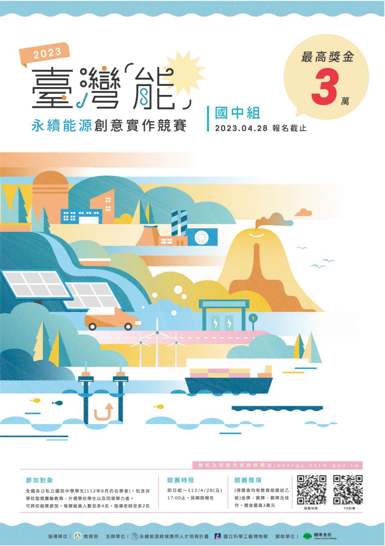 宣傳科工館112年度「臺灣『能」-永續能源創意實作競賽」國中組競賽辦法及電子海報,鼓勵師生踴躍組隊報名。