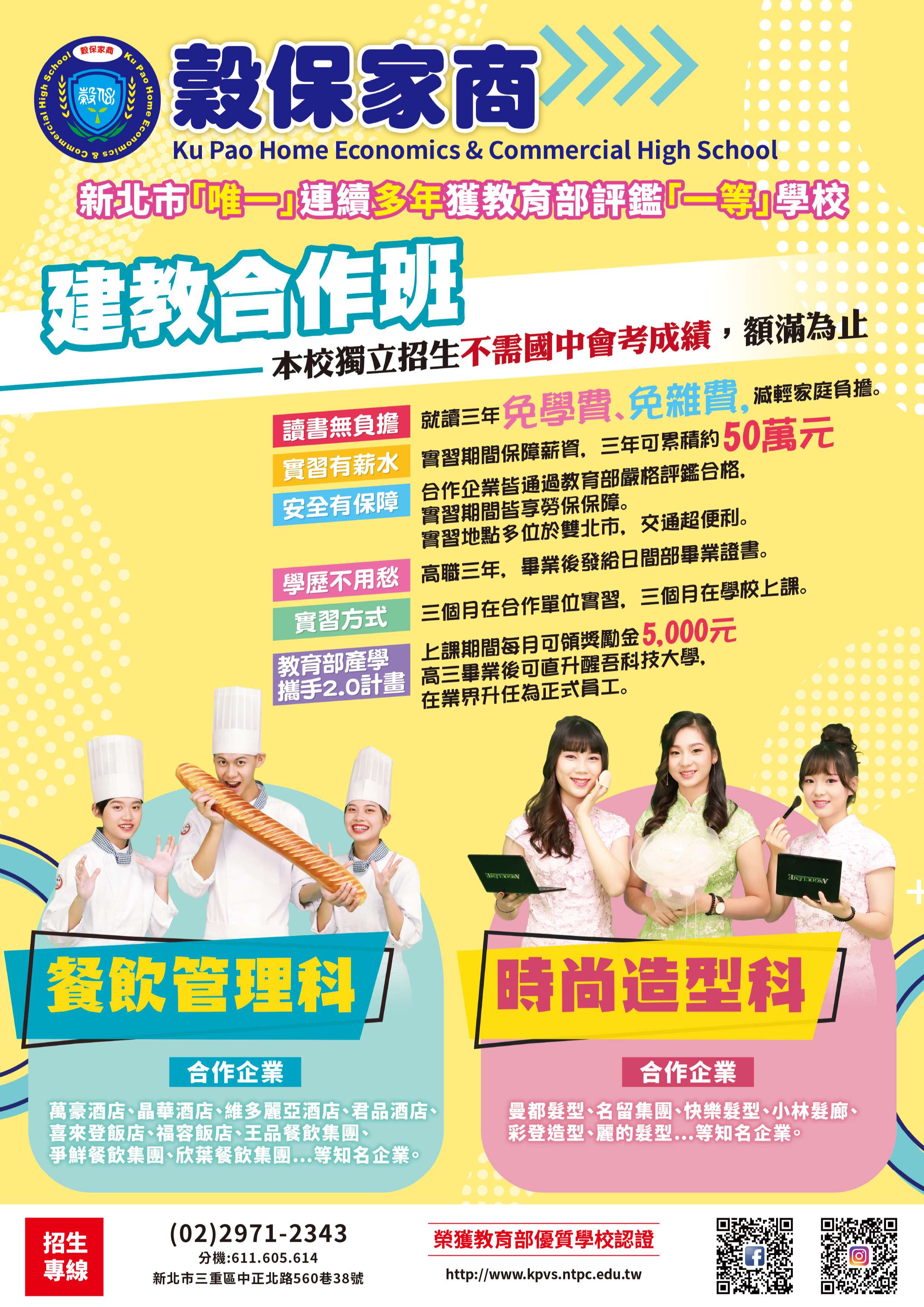 一、本校建教合作班為新北市唯一連續六年評鑑一等的優質學校,招生科別:輪調式時尚造型科及輪調式餐飲管理科。