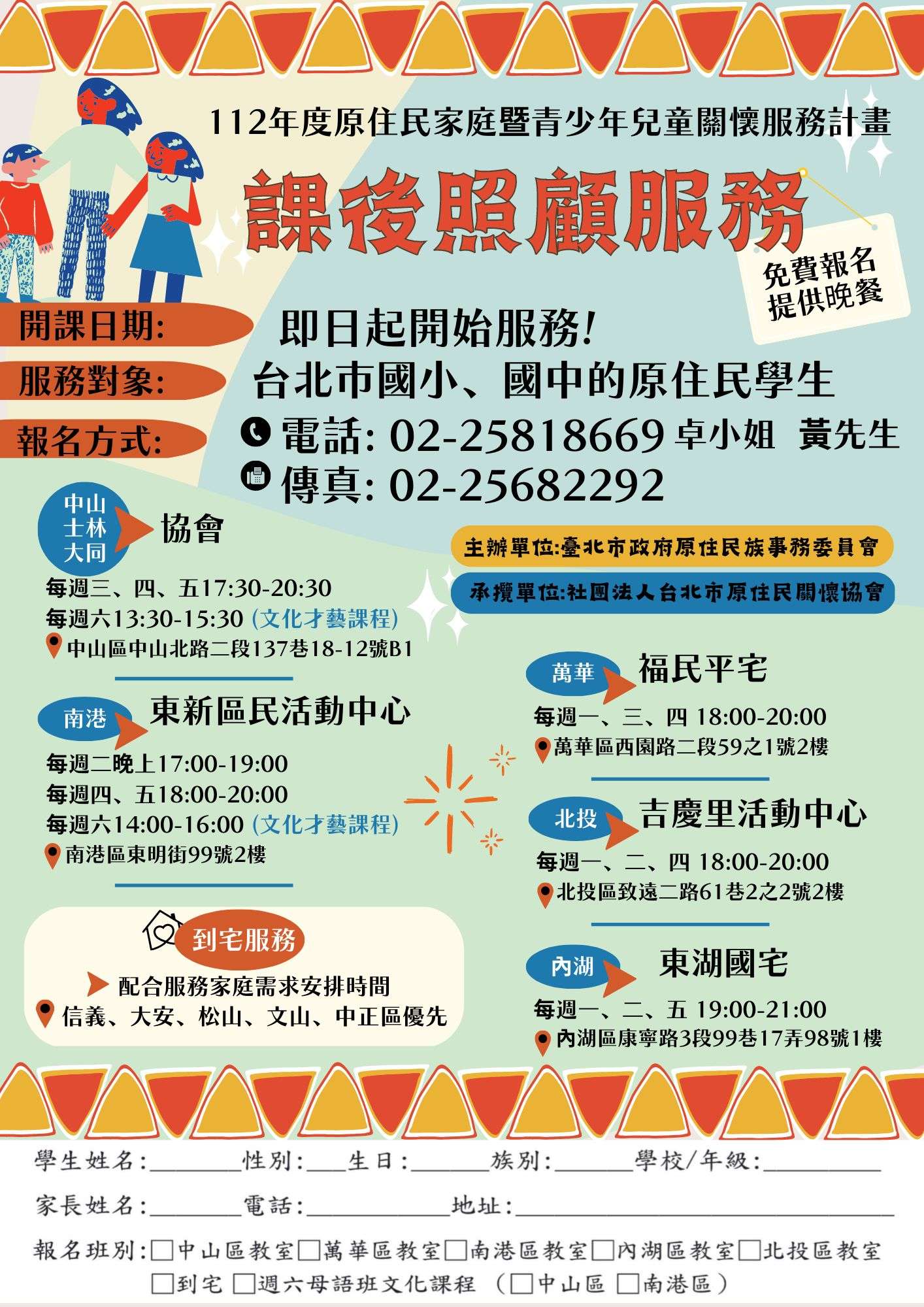 檢送本會委託社團法人台北市原住民關懷協會辦理「112 年原住民家庭暨青少年兒童關懷服務計畫」課後照顧宣傳報名表,惠請協助發送或轉知所轄原住民家戶踴躍報名參加,請查照。
