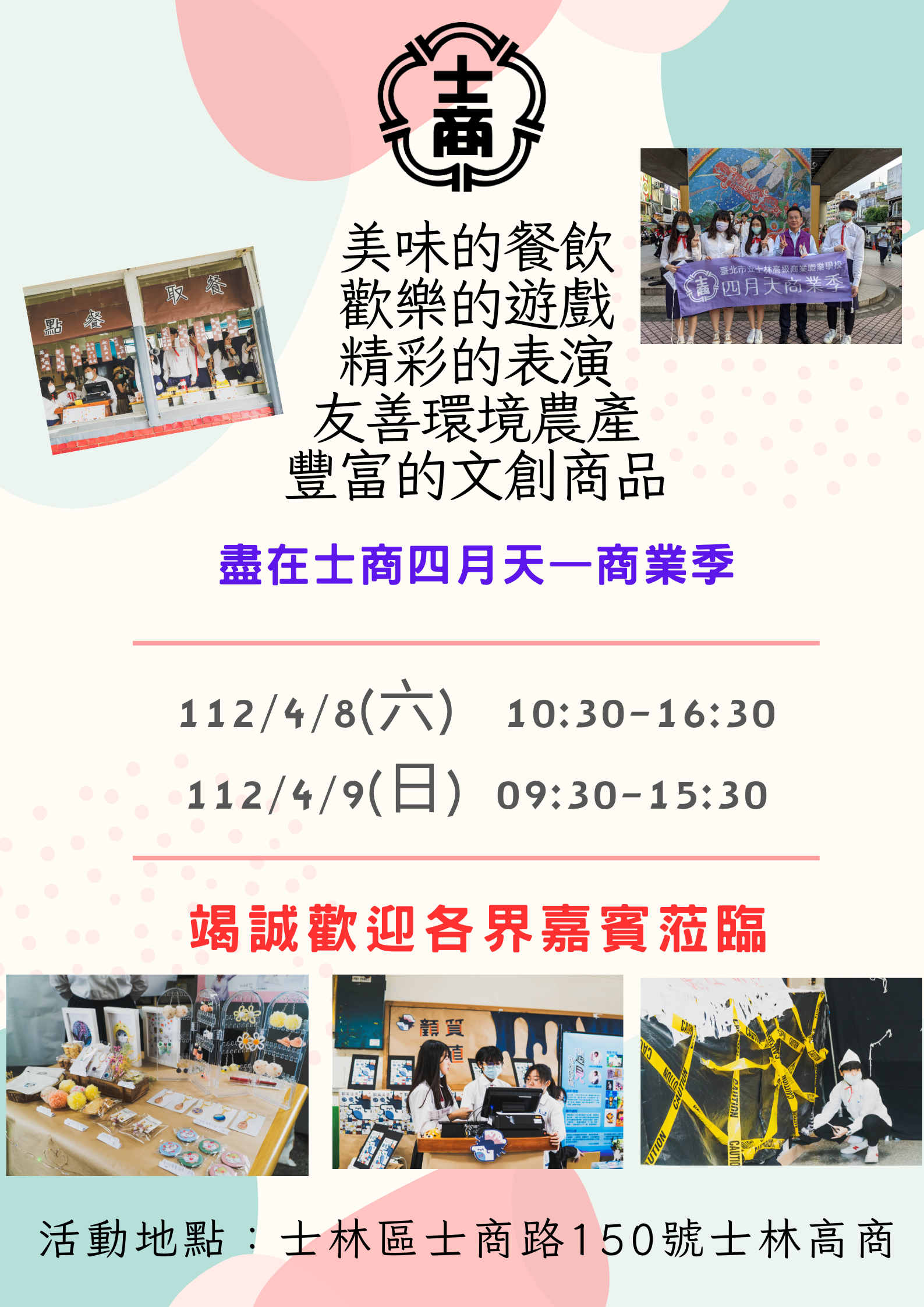 二、本校將於112年4月8日、9日辦理「士商四月天商業季」, 計有餐飲業、新住民特色商店、傳統農漁特產、文創市集等22間商號進行營業,周邊更有許多精彩配套活動,如北市各高中職社團精彩表演等,並搭配廣設科學生美展、門市服務科愛心義賣、與科大攜手合作各式體驗課程等,活動精采多元。