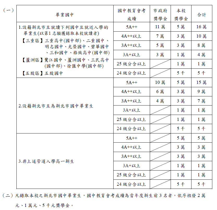 二、凡參加基北區各項入學管道,經錄取就讀本校之國中畢業生,當學年度國中教育會考成績達下列標準者,得核發獎學金詳如下表。