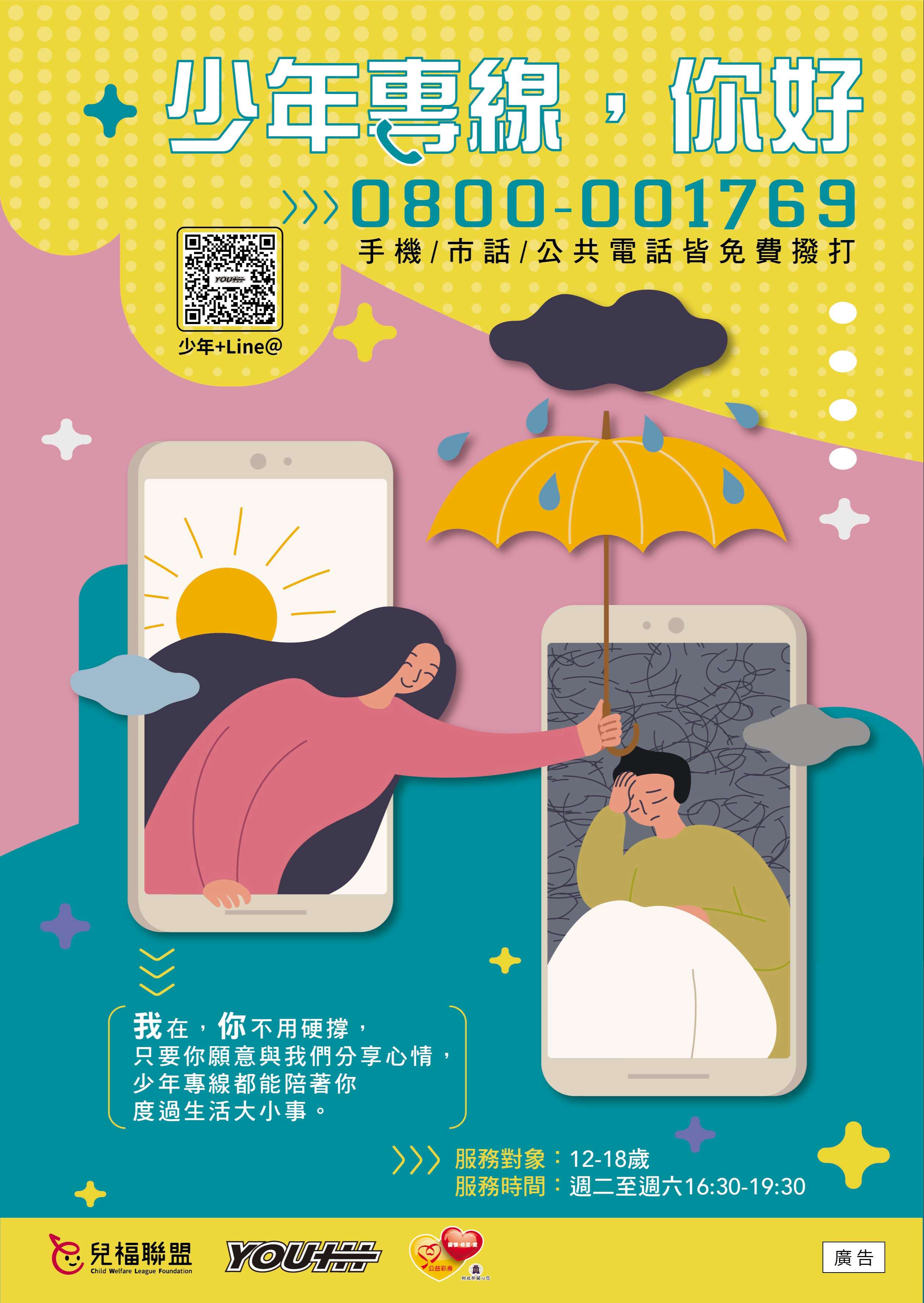 一、本會辦理「兒福聯盟-少年專線服務(0800-001769)」, 提供全台12歲至18歲之少年免付費電話諮詢服務,服務時間為每週二至週六下午4:30至7:30。期待透過此專線傾聽少年的需求,協助其抒發壓力,並引導、陪伴他們面對和解決困難。