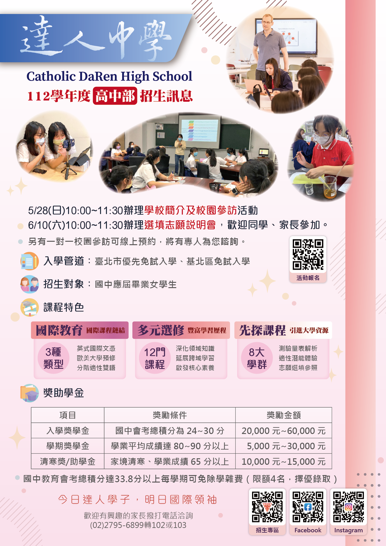 三、另本校於5月28日星期日上午10:00~11:30辦理學校簡介及 校園參訪活動,6月10日星期六上午10:00~11:30辦理志願 選填說明會,歡迎九年級女學生及家長踴躍報名參加,活動報名連結為https://forms.gle/nNmxRxATjNAfRvdg9。