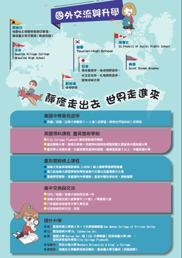 三、112學年度靜修高中設有高中部(升學班、雙語菁英班)、 高職部(應用英語科、應用日語科、商業經營科)。可輔導學生海外升學至日本、加拿大、美國、英國及西班牙等國。並推動臺英雙聯學制、臺加雙聯線上課程。