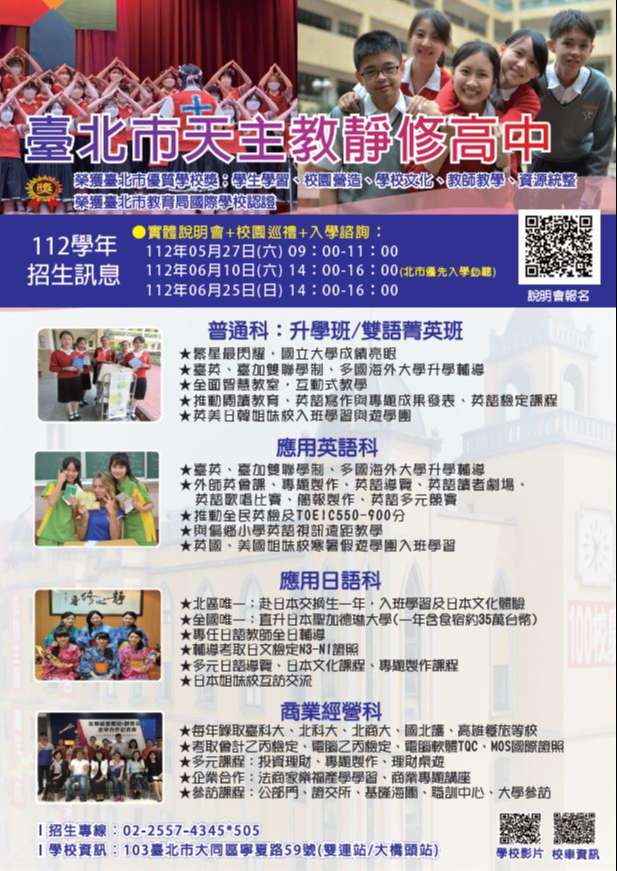 五、說明會報名請上靜修高中網頁:www.bish.tp.edu.tw或112 年度高中職招生博覽會。