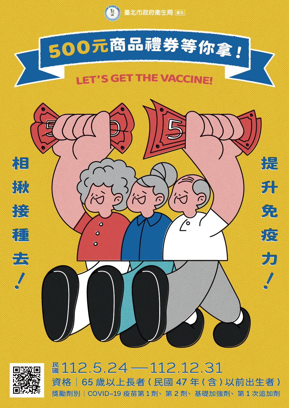 宣導臺北市為疫情趨勢提升長者免疫保護力,提供 65 歲以上長者接種 COVID-19 疫苗基礎第1、2劑、基礎加強劑及第1次追加劑,獎勵 500 元商品禮券。(廣告)