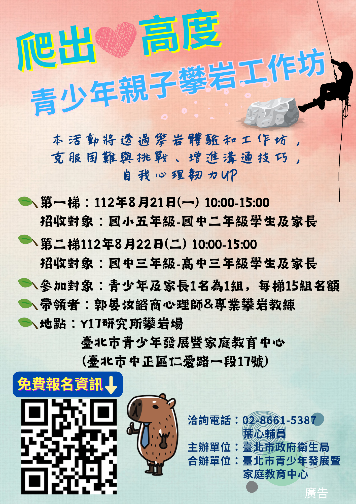 2、第二場次:8月22日(二)上午10時0分至下午3時0分, 對象為升國中三年級至高中三年級學生及家長,共15 對親子。