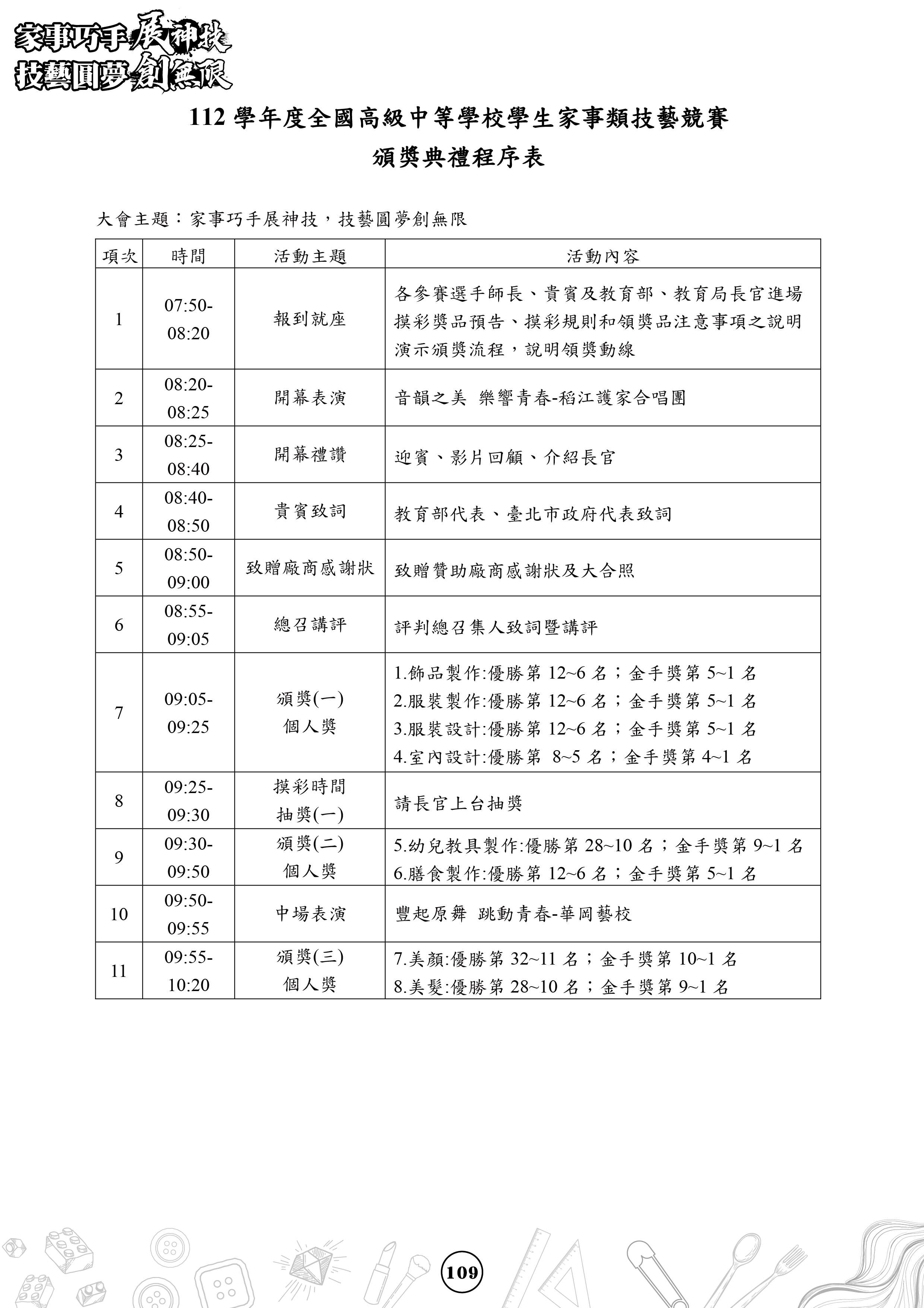 (一)活動名稱:「112學年度全國高級中等學校學生家事類技藝競賽」頒獎典禮暨參賽作品展示活動(如附件)。