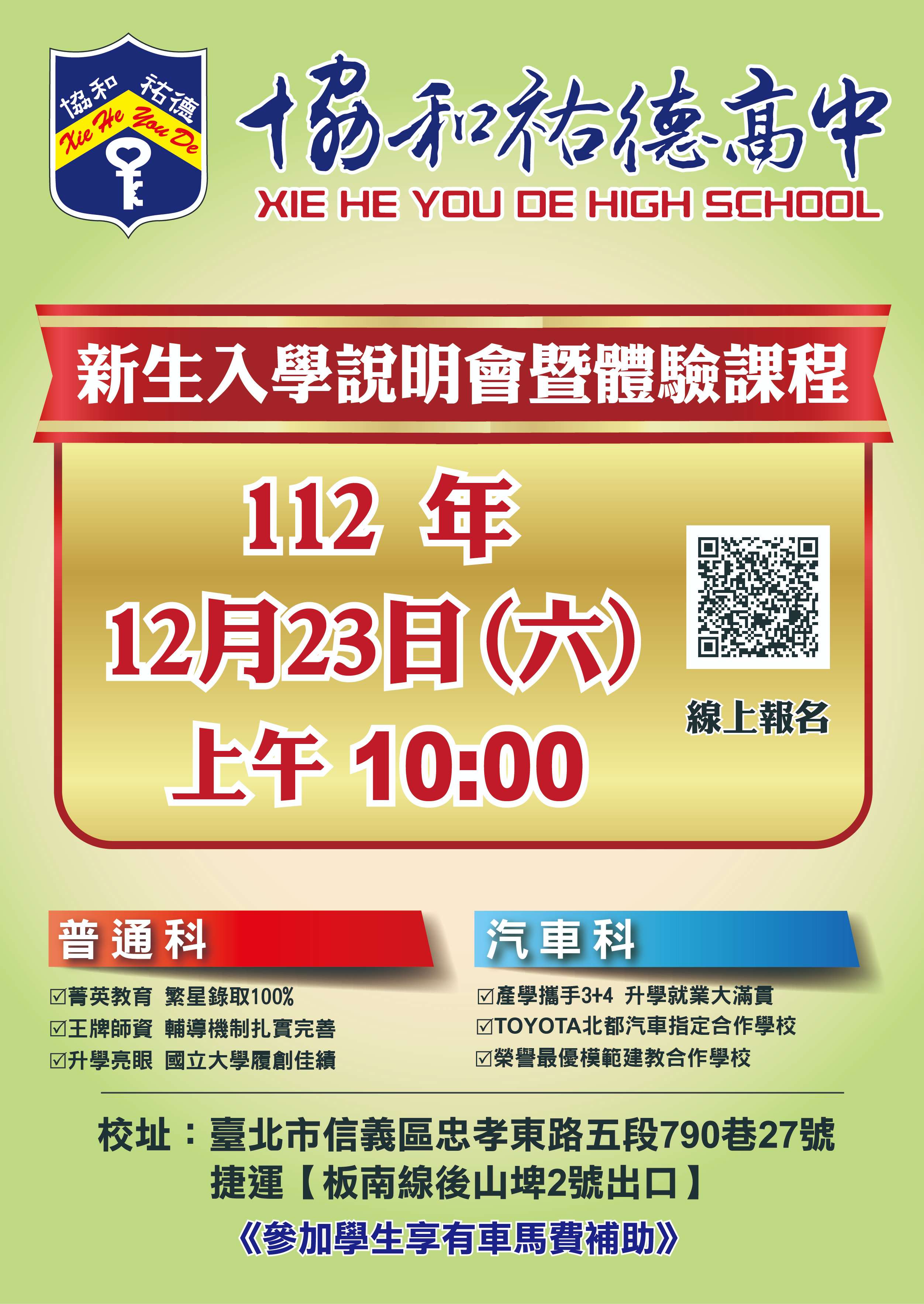 臺北市協和祐德高中辦理「普通科-升學進路、教學特色;汽車科-技職特色、體驗課程」說明會