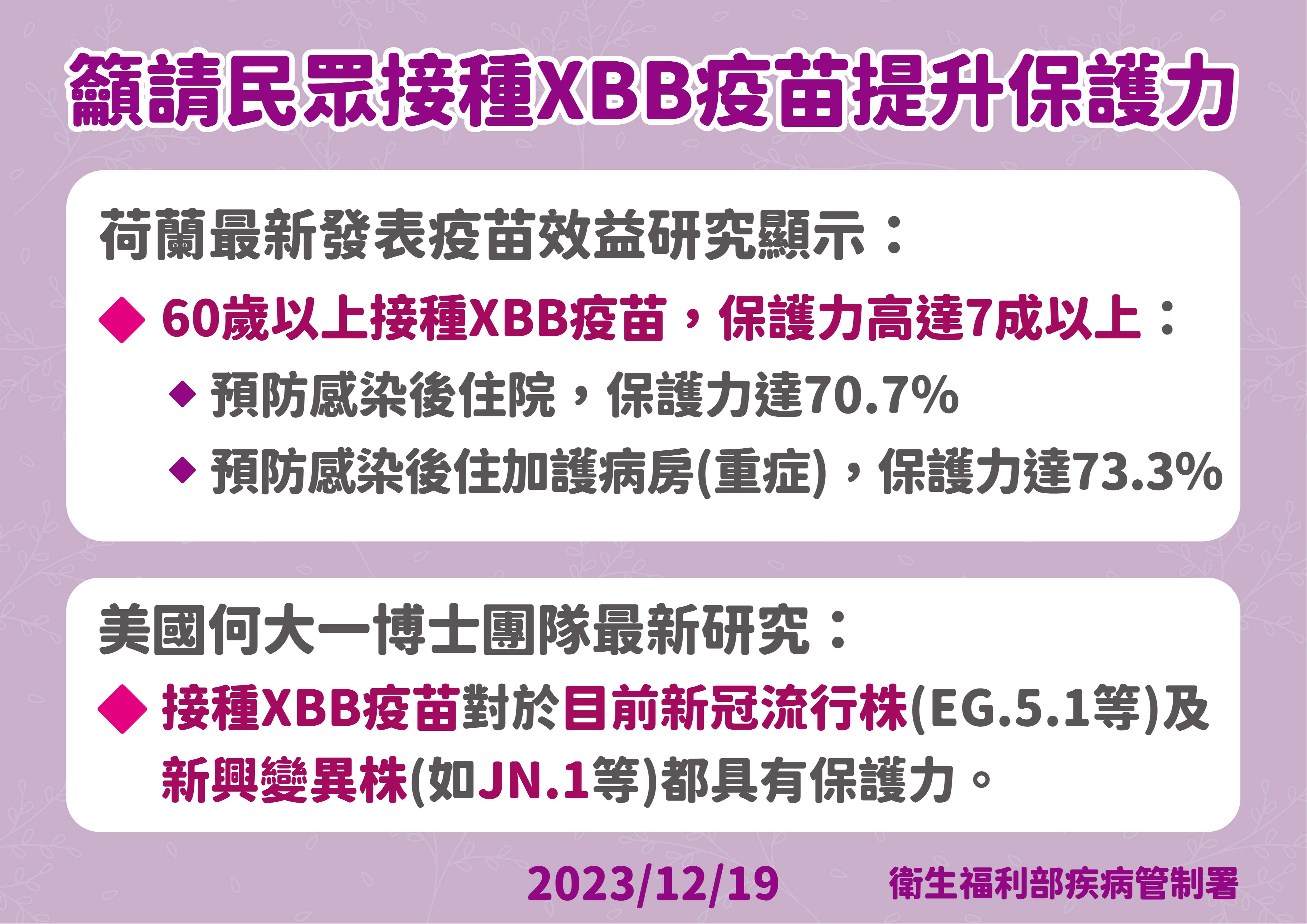 3.新冠疫情升溫,病毒持續演變,新冠XBB疫苗對於現階段變異株均有保護力,可降低感染後重症及死亡風險,
