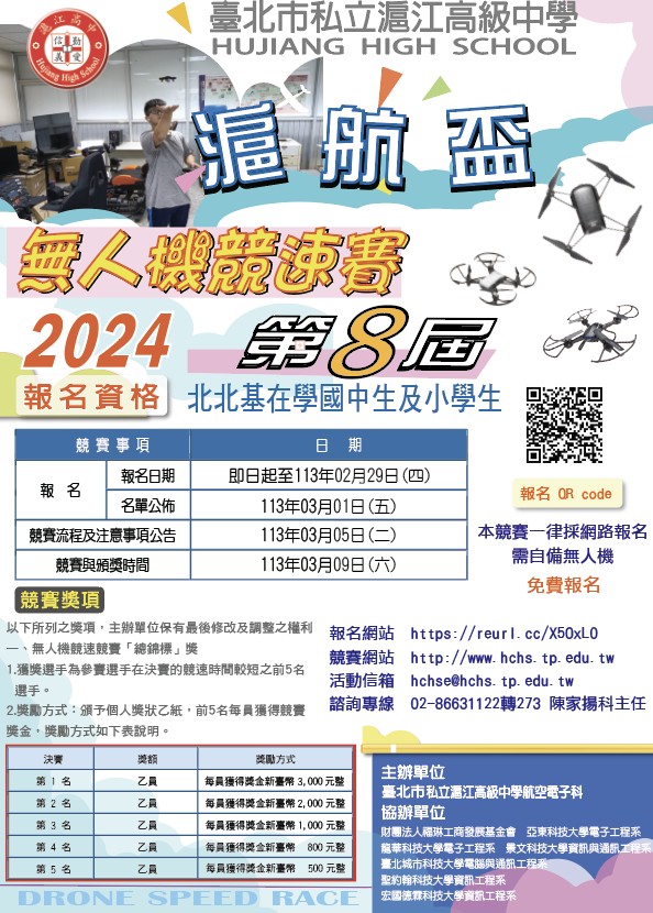 一、本校訂於113年3月9日(星期六)辦理「滬航盃」無人機競速競賽活動,實施計畫及報名資訊如附件。