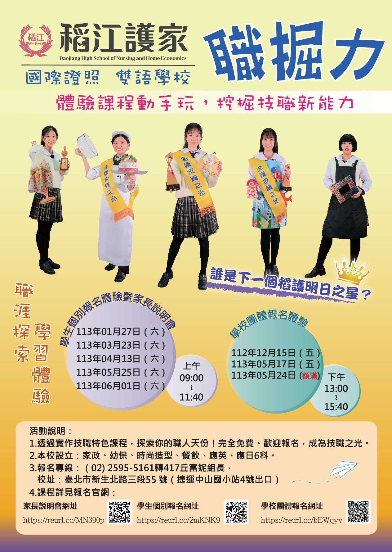 本學期於113年3月23日(六)、4月13日(六)、5月17日 (五)、5月25日(六)、6月1日(六)辦理「稻江護家職掘力實作體驗」,