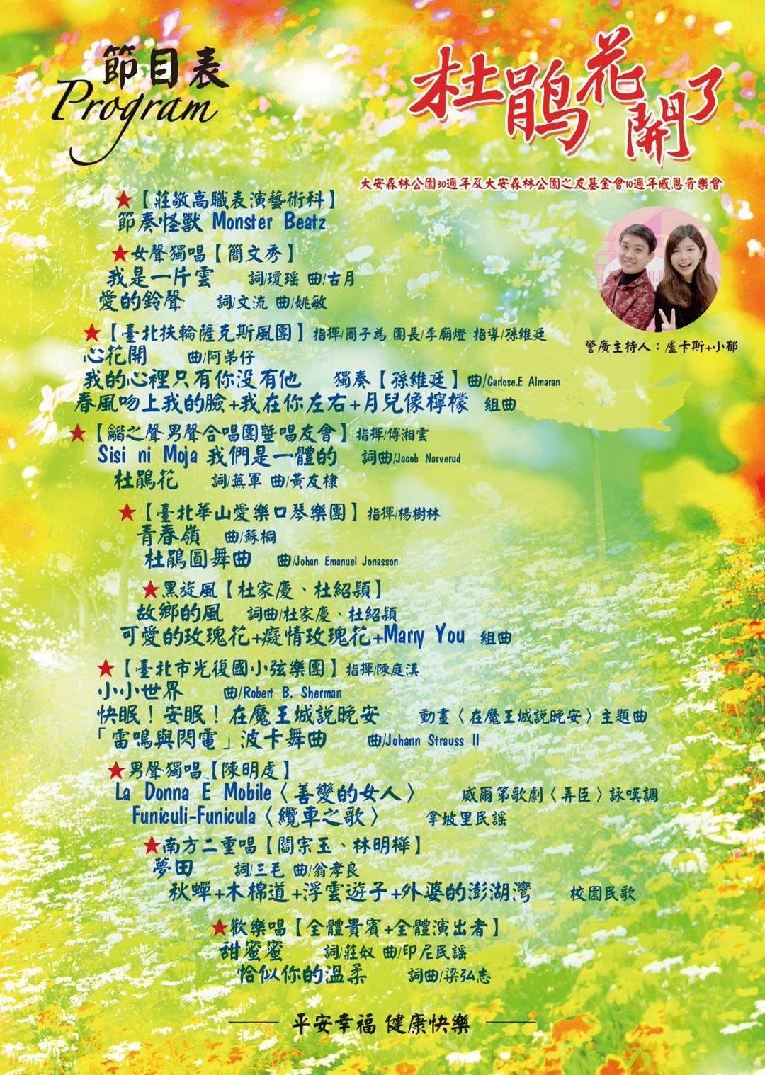 「杜鵑花開了感恩音樂會將於3月30日下午14時00分至16時00分於大安森林公園露天音樂台舉辦,邀請您共享春日的午後時光!」