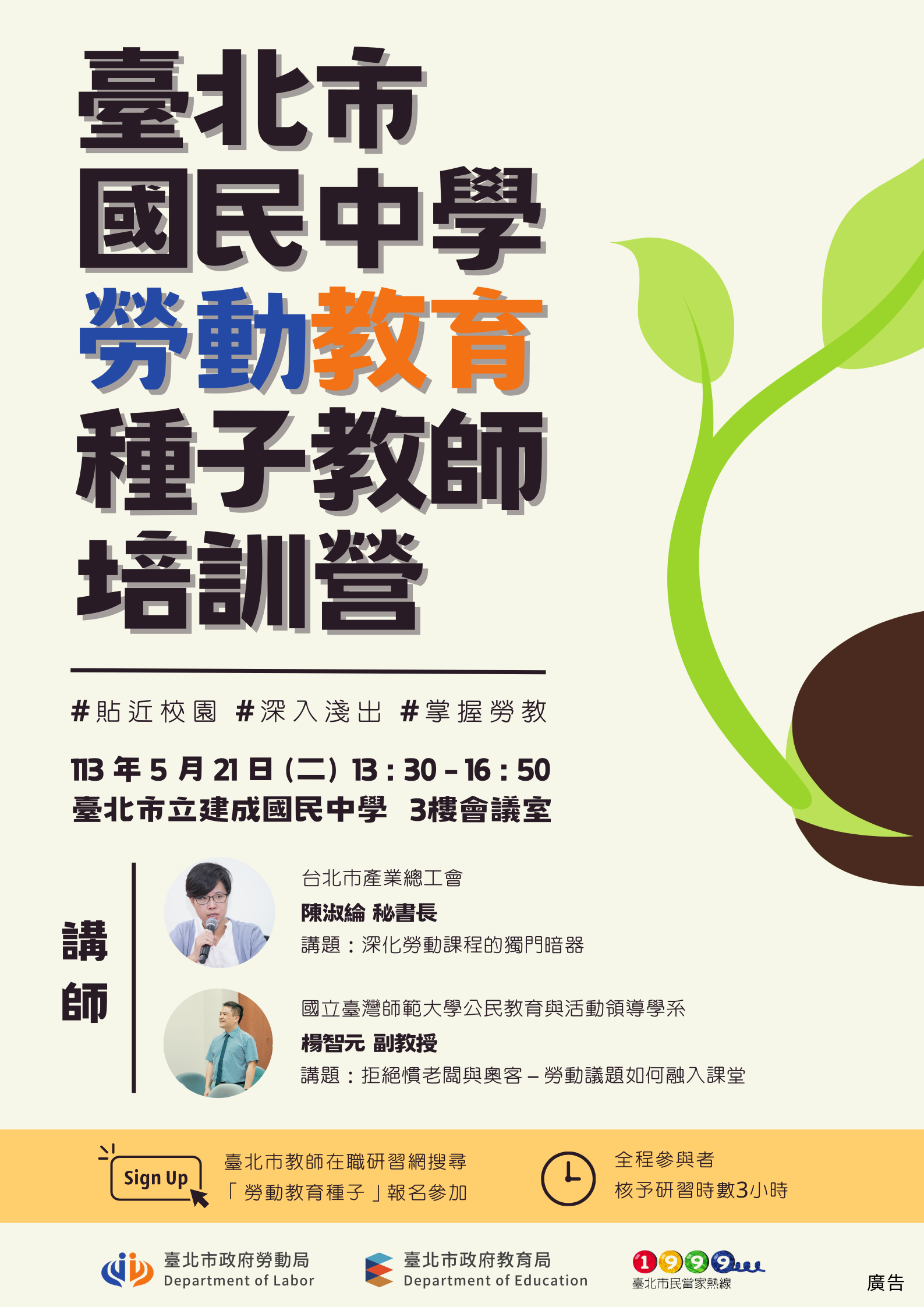 (四)報名方式:請逕至臺北市教師在職研習網 (https://insc.tp.edu.tw/)報名,全程參與者,核予研習時數3小時。