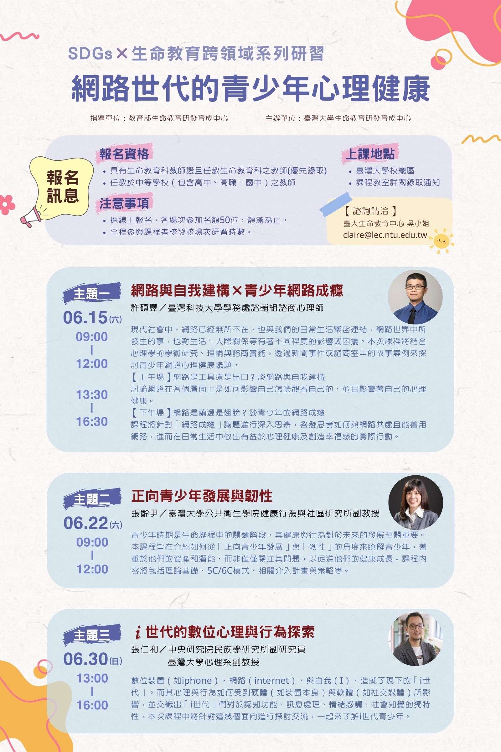 國立臺灣大學辦理「SDGs×生命教育跨領域系列研習-網路世代的青少年心理健康」