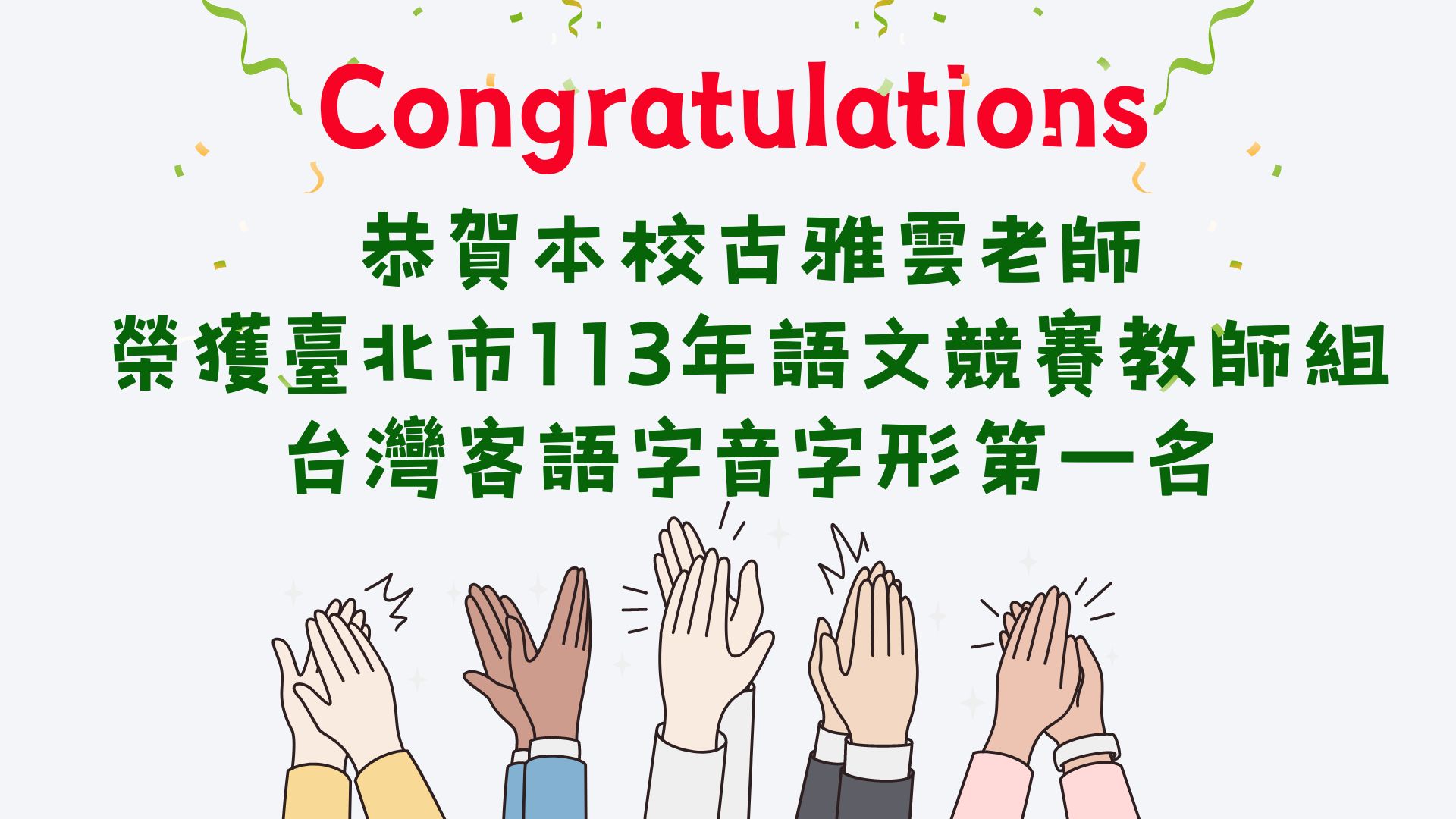 賀~本校古雅雲老師榮獲臺北市113年語文競賽教師組台灣客語字音字形第一名!!!