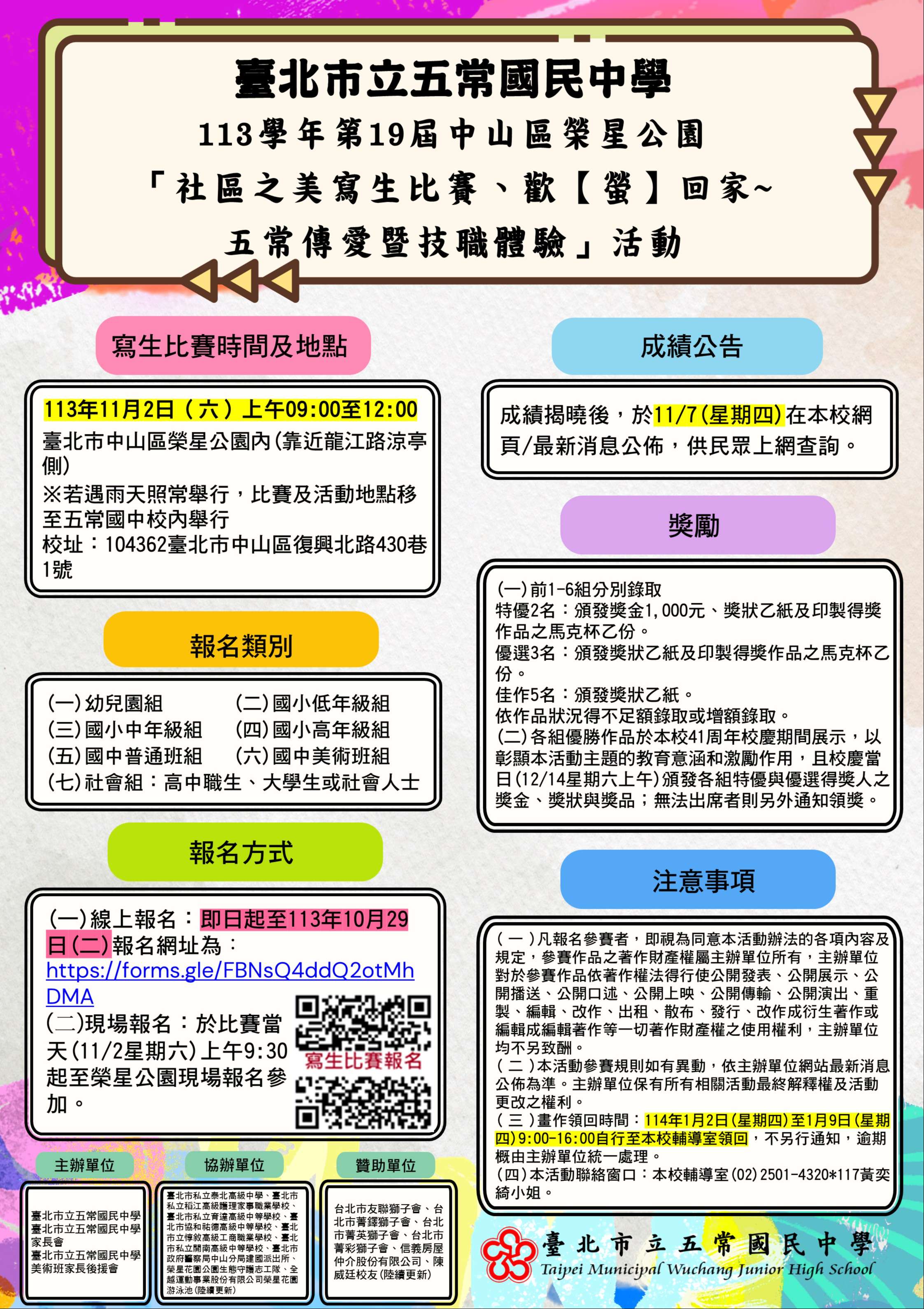 一、比賽時間:113年11月2日(星期六)早上9時至12時整。 比賽地點:榮星公園內(臺北市中山區民權東路三段與龍江路口),若遇雨天照常舉行,比賽地點移至五常國中校內。